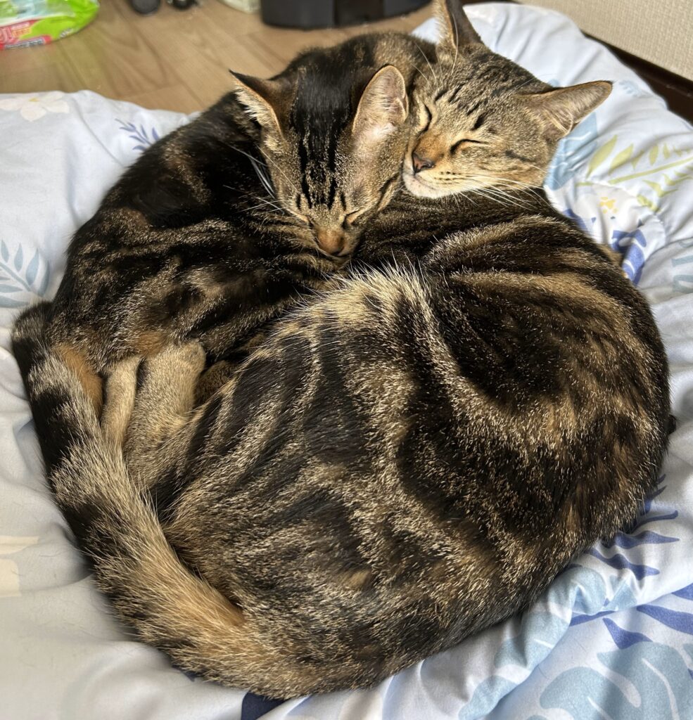 仲良しでいたずら小僧で甘えん坊のそうくん、さくくんの兄弟がトライアルを終えて新しい家族として迎えられました。相変わらずの甘えん坊で、里親さんがお仕事から帰ってくるとお膝を占領してしまうそうです。とっても可愛いくて動けず、何もできないと嬉しい悲鳴をあげられています😁まだまだ子ねこで元気な兄弟は、夜中には大運動会をするそうで里親さんは寝不足気味💦。遊ぶのも一緒、ご飯も一緒、寝るのも一緒、いつまでも仲良しの兄弟です。これからも仲良く幸せにね💕