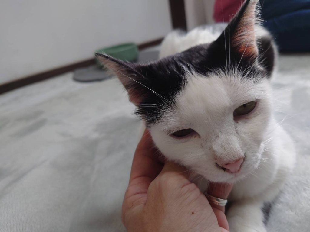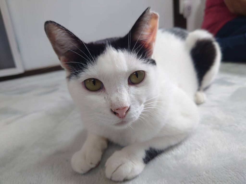 今年の1月に入店したハチワレ猫の『みきちゃん』。人懐っこく、名前を呼ぶと「にゃ~」とかわいい声でお返事をしてくれます。多頭飼育崩壊の場より保護された子で、保護される前は人間の食べ物(特にパンなど)を食べていたため、すーにゃんに来た頃はカリカリをほぼ食べませんでした。2週間ほどのハンガーストライキの後、やっと少量のカリカリと焼きカツオのレトルトを混ぜたものを口にするようになりました。レトルトを混ぜる割合を変え調整していった結果、最終的にはカリカリだけで食べられるようになり体重も増えました。その後も、お腹をこわしたり結膜炎っぽくなったりと色々ありましたが、す-にゃんにも慣れて元気で楽しく過ごしてくれていました。そのみきちゃんが他のカフェに移ることになったのが8月初旬。大丈夫かなぁとスタッフが心配する中、移動していったみきちゃん。先日、スタッフの一人が移動先のカフェにお邪魔したところ、先輩カフェスタッフとしてしっかり頑張っているみきちゃんと再会出来ました。「しっかり頑張ってしあわせを掴むんだよ」と願うスタッフ一同です。