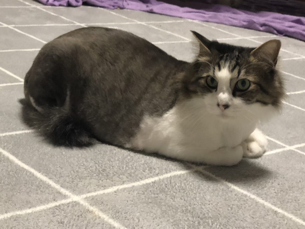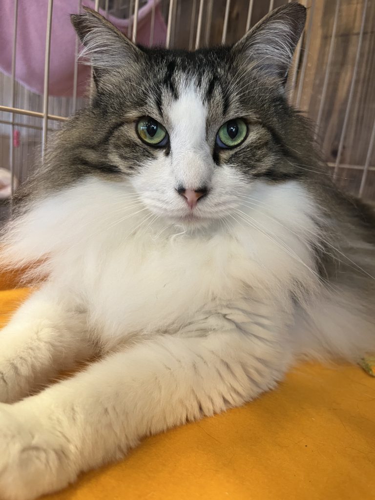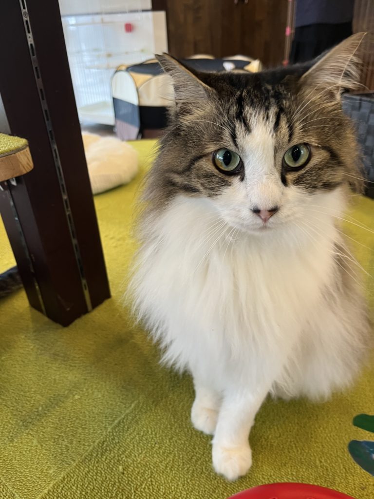 昨年の2月に入店した初めての長毛の「ぷー」。仲良しの「きゅう」と一緒にすーにゃんにやってきました。とっても仲良しの2匹はケージから出てもよく一緒にいました。ぷーは警戒心が強く、キャットウォークの上にいることが多かったのですがおやつは大好き。常連のお客様がおやつを買ってくださるとすぐに寄ってきて可愛い声で鳴いてもらっていました。長毛のために毛玉ができやすく、ブラッシングやトリミングをしないといけなかったのですが、警戒心が強すぎてすーにゃんのスタッフは近づくことが出来ませんでした😫可愛さを大好きになって下さった里親さんのところでトリミングもしてもらい、先住猫さんとも仲良しになって幸せに暮らしています。余談ですが、ぷーがトリミングを終わって短い毛になって帰って来た時は先住猫さんに他の猫と思われたのか「シャー」と言われてしまったそうです。(≧∀≦)ゞ