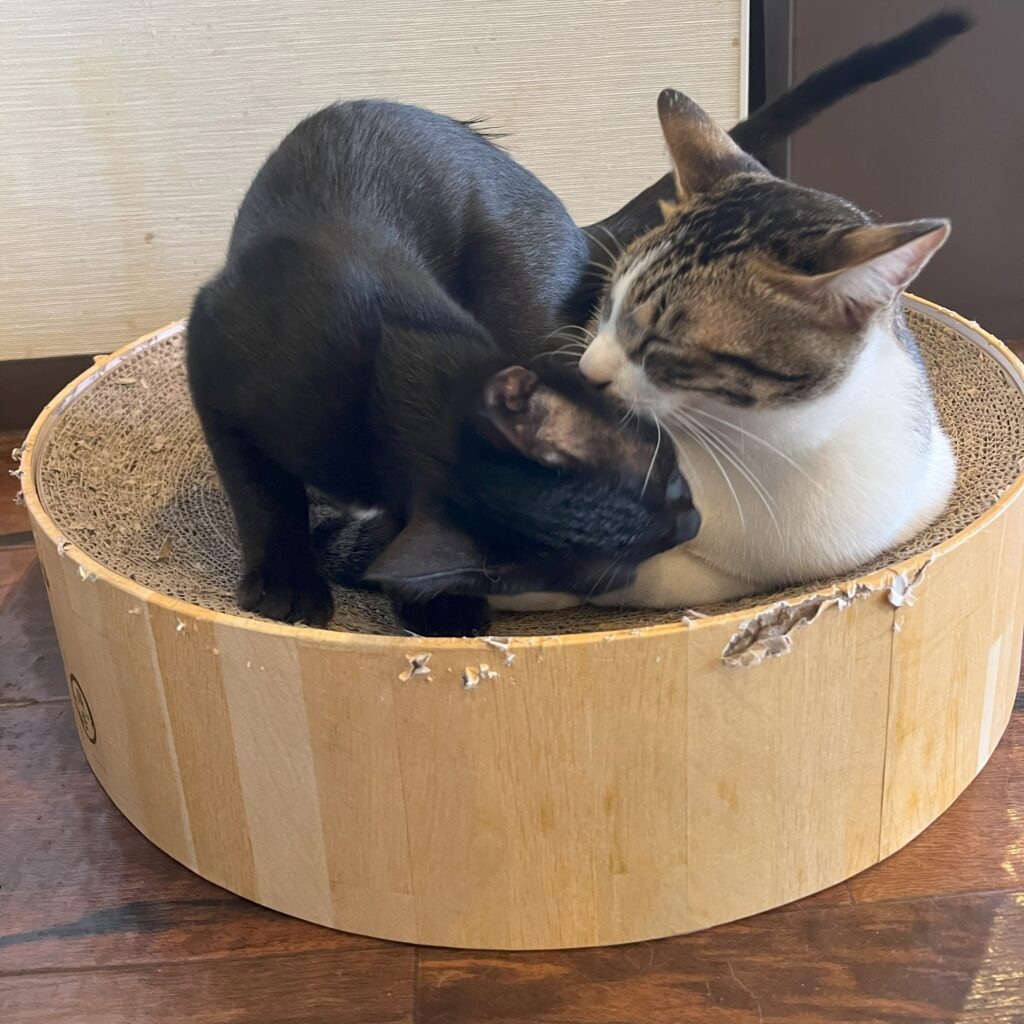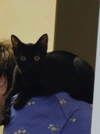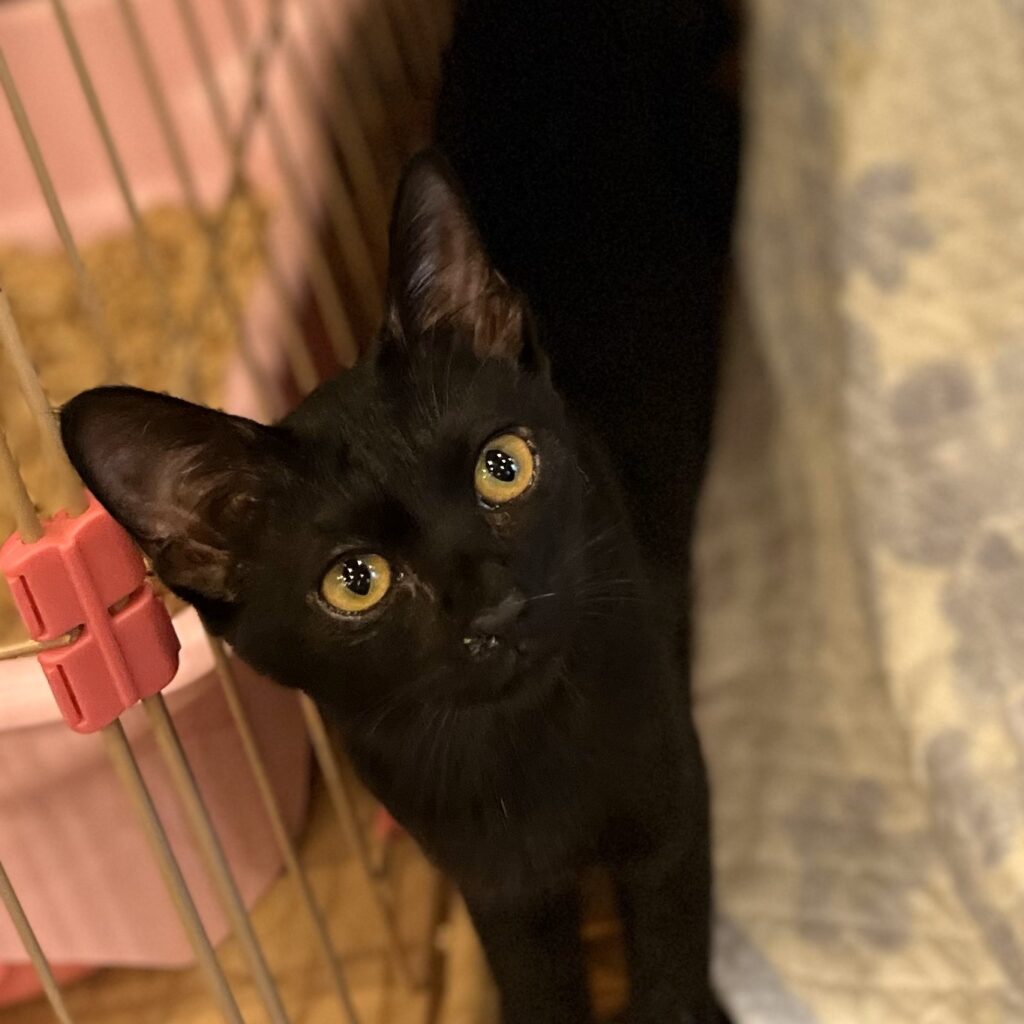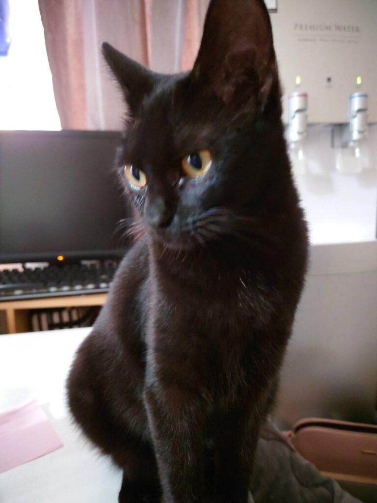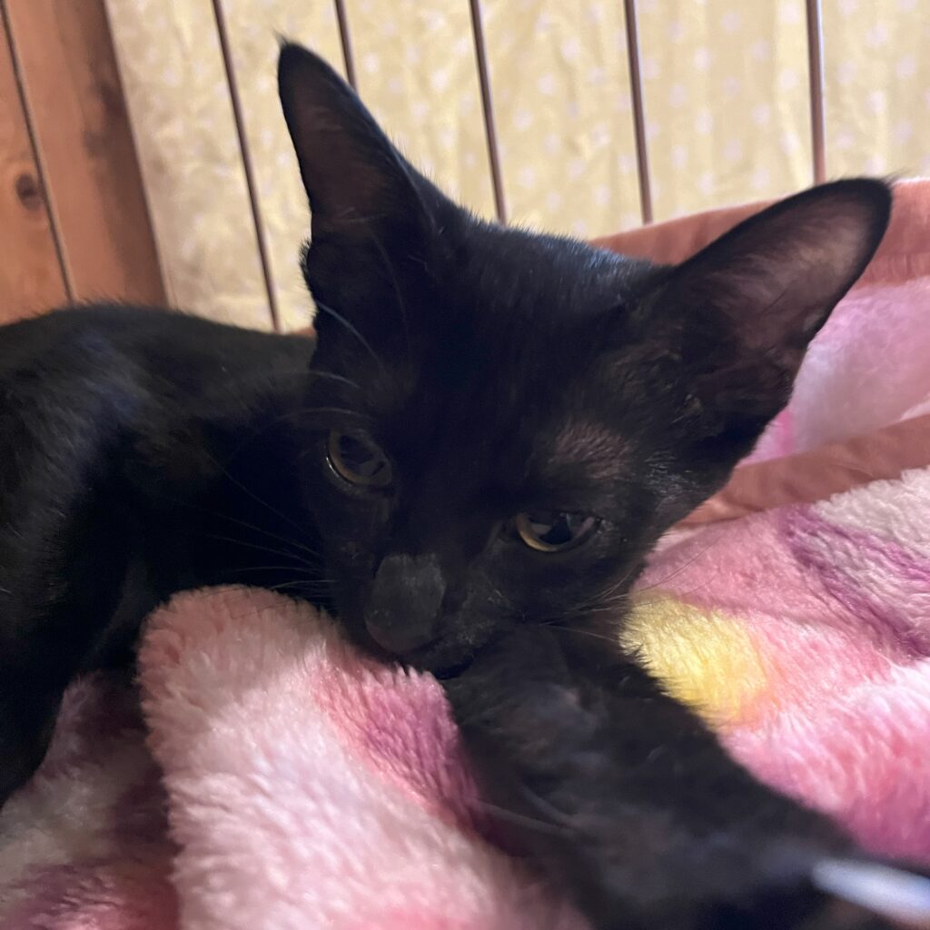 おてんば娘だった黒猫のクローバー。暴れん坊のもっちとよく一緒に遊んでいて、もっちをお兄ちゃんへと成長させてくれました。よく遊び、よく寝る元気な女の子。甘えん坊の所もあって、眠たくなるとスタッフの指をチュパチュパ吸っていました。ビゴライブでのライブ配信をいつも見に来てくれていた方がクローバーをとても気に入って下さって、里親さんになるべく、東京からわざわざ会いに来て下さいました。来阪して、早々に保護主さんと面談。東京に戻る際に連れて帰ってくださいました。先代猫さんに似ているらしく、とっても可愛がっていただき、お腹の上で眠ったり、チュパチュパしたり、肩に乗ったりととても甘えん坊さんになって幸せに暮らしています。「めいめい」とよく鳴くので、新しい名前は「めいちゃん」になりました。