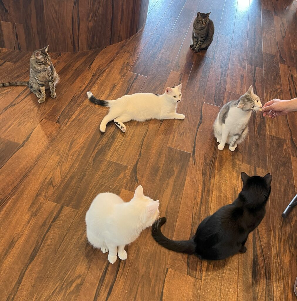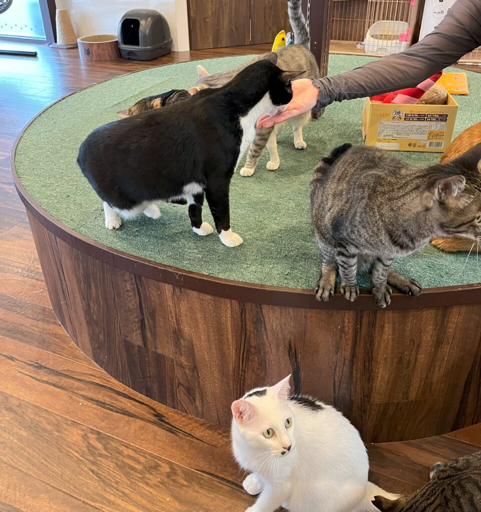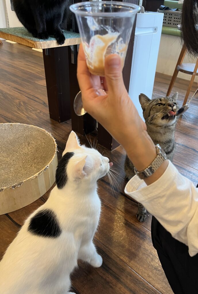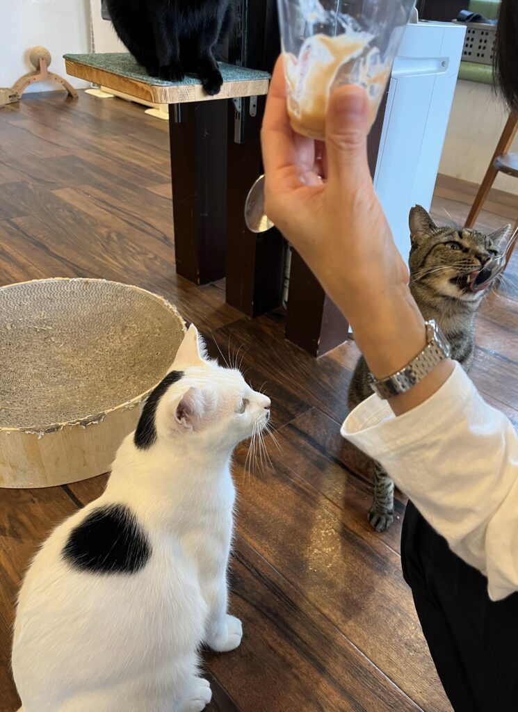 すーにゃんでは、店内での飲食や人間の食べ物をニャンスタッフ達にあげる事、また、猫おやつの持ち込みは禁止となっております。お腹を壊す可能性や体調を悪くしてしまう食べ物もあるからです。店内には、ニャンスタッフ達にあげて頂けるおやつを用意しております。一番人気は、ささみをフリーズドライしたもの。お客様のご注文が入るとニャンスタッフ達が急にソワソワしだします😁。手のひらに乗せてあげる事が多いので、一気に集まって来るニャンスタッフ達に「こわい~😭」と泣き出してしまうお子様もいらっしゃいます💦ペロペロおやつも人気です。スプーンで少量ずつすくってあげられます。店内には、色々なおやつの出てくるガチャガチャもあります。何がでるかはお楽しみ。食の好みがうるさいシンバは、ガチャガチャのカリカリのおやつや、かにかまが大好き💖ガチャガチャの大当たりは、まぐろのフリーズドライ🐟。ぜひ、当ててください!