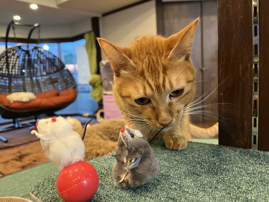 「むしゅ」は、2021年春生まれの茶トラの男の子。むしゅは気に入った人にはよく甘えますが、茶トラに似合わず警戒心が強いので、ケージの上やキャットウォークの上にいることが多いです。性格はとても穏やかで優しい子です。他の子たちと喧嘩をしたことは一度もなく、怖くても逃げていくだけで「シャー」と威嚇することはあません。平和主義者ですね( ´∀` ) むしゅはいつもお目目👀くりくりで驚いたような顔に見えます。この春でやっと2歳。まだまだ遊ぶのも大好きです。チャームポイントは、ウィスカーパッド(ひげ袋)にある茶色いポッチ。両側に会ってえくぼみたいで可愛いですよ。