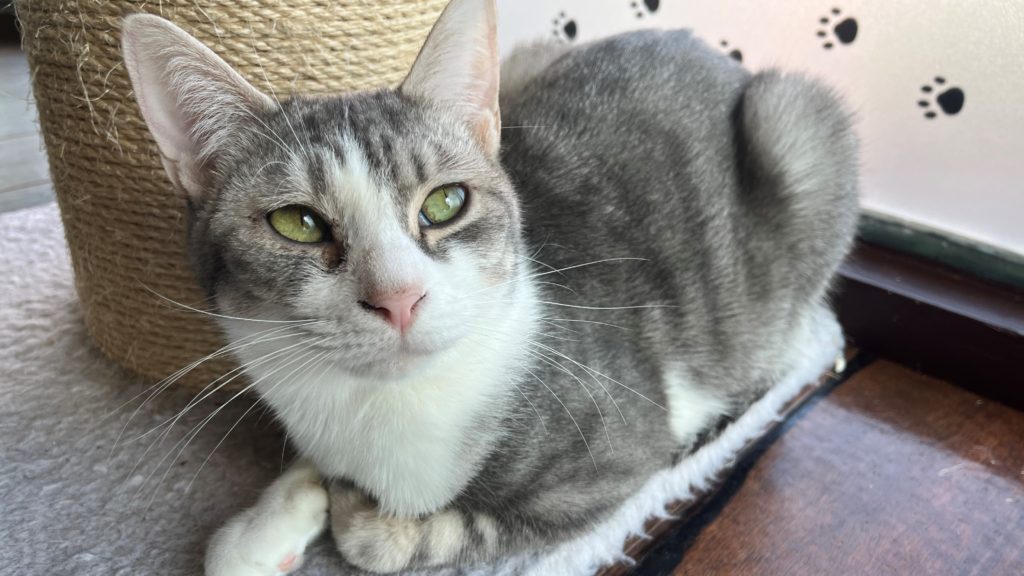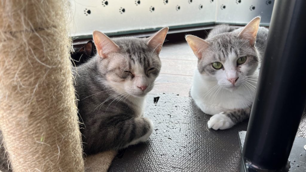 すーにゃんの開店から、1ヶ月ほどして入店してきた「トム」と「タフィー」のサバ白兄弟。サバ白の性格は2種類あるそうで、それも両極端。“人懐っこくて友好的”または、“警戒心が強く神経質”。残念ながら(?!)トムとタフィーは後者。とてもきれいな毛色で男前兄弟なのですが、来店当初から警戒心がすごい!来店してから少しの間は隔離期間としてケージの中で過ごすのですが、ケージの扉を開けようものなら大きな口を開けて「シャー!!」と威嚇。指を差し出すと猫パンチ💦。ケージの外に出てからもなるべくキャットウォークの上やケージの上の人の手の届かないところで落ち着いていました。それでも少しずつすこしずつ、下に降りてきて時々猫じゃらしにじゃれたりするようになり、入店から1年少したって、やっと、キャットウォークの下や猫ベッドなどで寝るようになったり、おやつを貰いに来たりするようになりました。それでも、夕方の特別ご飯の「モグモグタイム」では、近づくと逃げるのでお皿をトムとタフィーの前へカーリングのようにスライドさせて渡しています。他の猫スタッフのようにナデナデさせてくれるのはいつのことやら(^▽^;) それが楽しみでもありますが💕