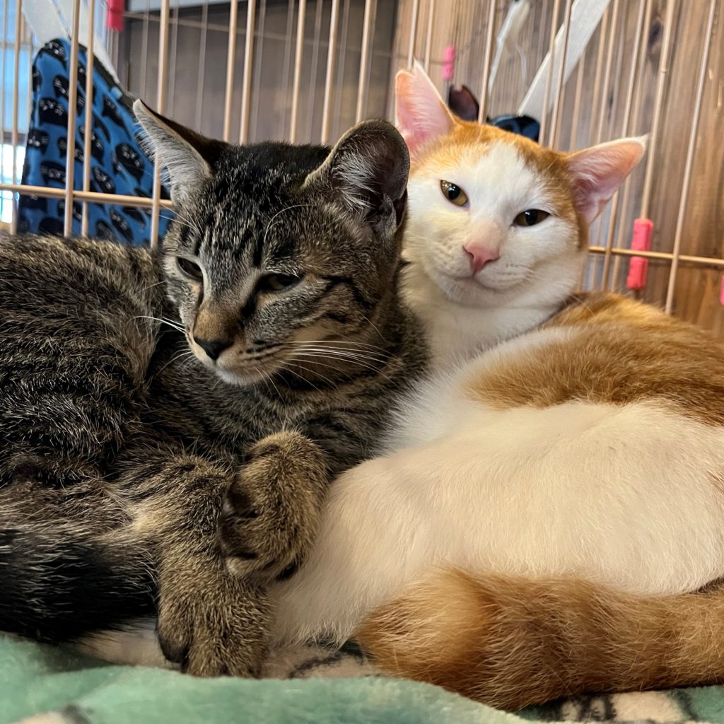 夏ごろに、仔猫スタッフとして他の兄弟たちと一緒にブログで紹介した「びさく」。他の兄弟たちは別のねこカフェさんへ移動してしまいましたが、「びさく」だけはすーにゃんに残ることになりました。しばらく、ケージの中で一人寂しく過ごしていましたが、少しして「しま」がすーにゃんにやってきました。「しま」も他の兄弟たちには里親さんが見つかったものの「しま」だけは巡り合えなかったため、すーにゃんにやってくることになったのです。そんな二人がすーにゃんで出会い、同じケージの中で過ごすことになりました。「けんかしてしまわないかなぁ?」というスタッフの心配をよそにとても仲良しになりました。実の兄弟以上に、じゃれあっていたわりあって過ごすようになっています。