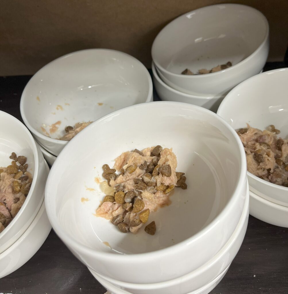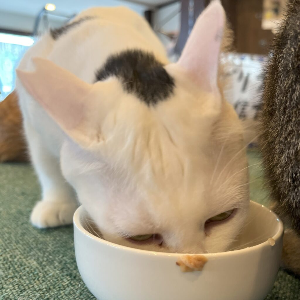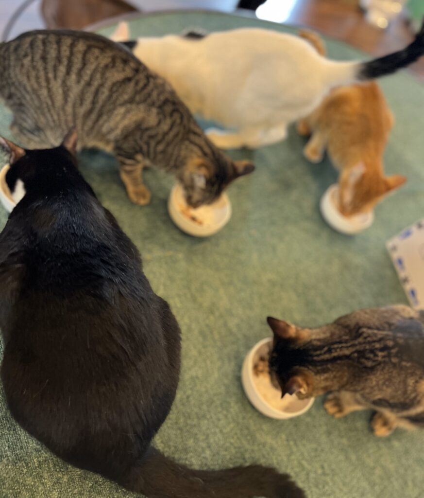 今日は、久しぶりのモグモグタイム。普段はバックヤードにドライフードや水が置いてあり、いつでも好きな時に食べられるようになっています。モグモグタイムは、特別ご飯。ドライフードにパウチや缶詰などを混ぜていつもとは一味違うご飯タイムです。きちんとそれぞれ一皿ずつ用意して配ります。一番人気は焼きカツオパウチ!混ぜるものによっては不人気で残ってしまうものも💦(特にシンバは、グルメ?なのでなかなか気に入るものが…)準備をしている間も、においを察知して混ぜている足元をウロウロ🤣🤣じげんやれいじは、「ちょうだい!ちょうだい!」と鳴いて大騒ぎ。今日は、みんな、おいしく完食してくれました👏👏👏