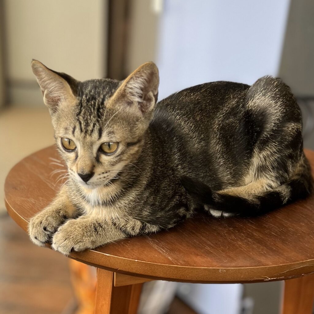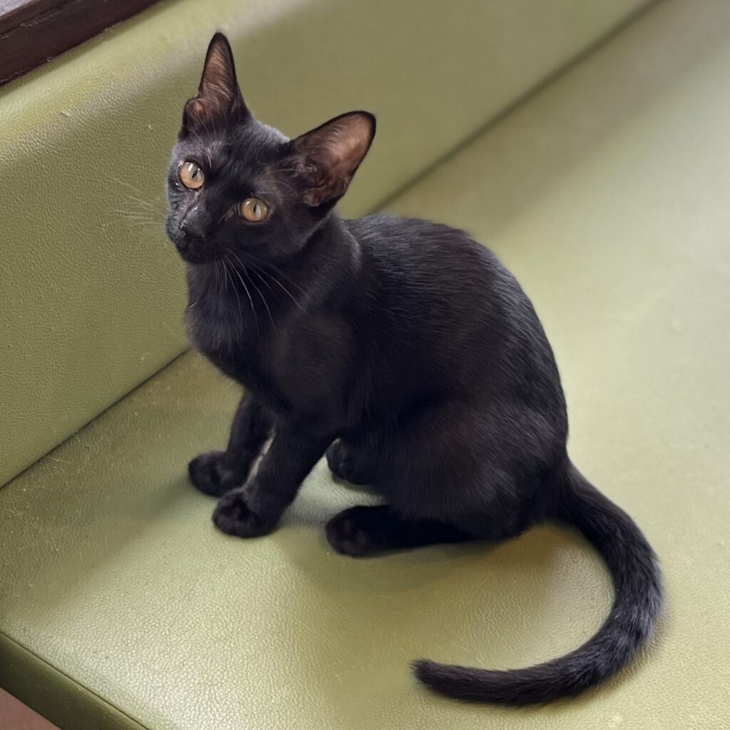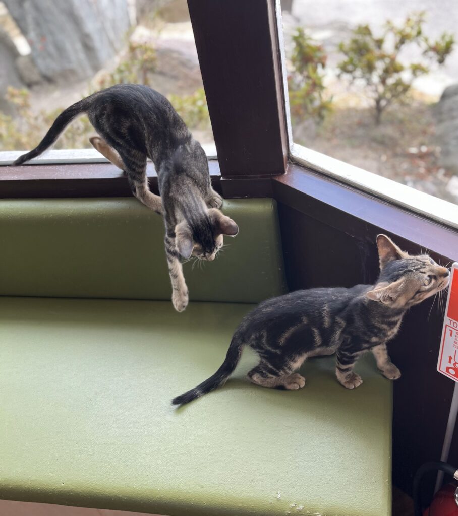 すーにゃんには、今、3匹の仔ニャンスタッフがいます。4ヶ月の黒猫の女の子「クローバー」と3ヶ月のキジトラの兄弟の「そう」「さく」。3匹ともとても元気で、開店と同時にエンジン全開で遊びます。お転婆娘のクローバーちゃんは、自分のしっぽを追いかけてクルクルまわったり、キャットウォークに登ったり目が離せません💦 そうとさくの兄弟は仲良しでいつも一緒にプロレスごっこや追いかけっこで店内を走り回っています。そんなかわいい仔ニャンスタッフに会いにいらっしゃいませんか?