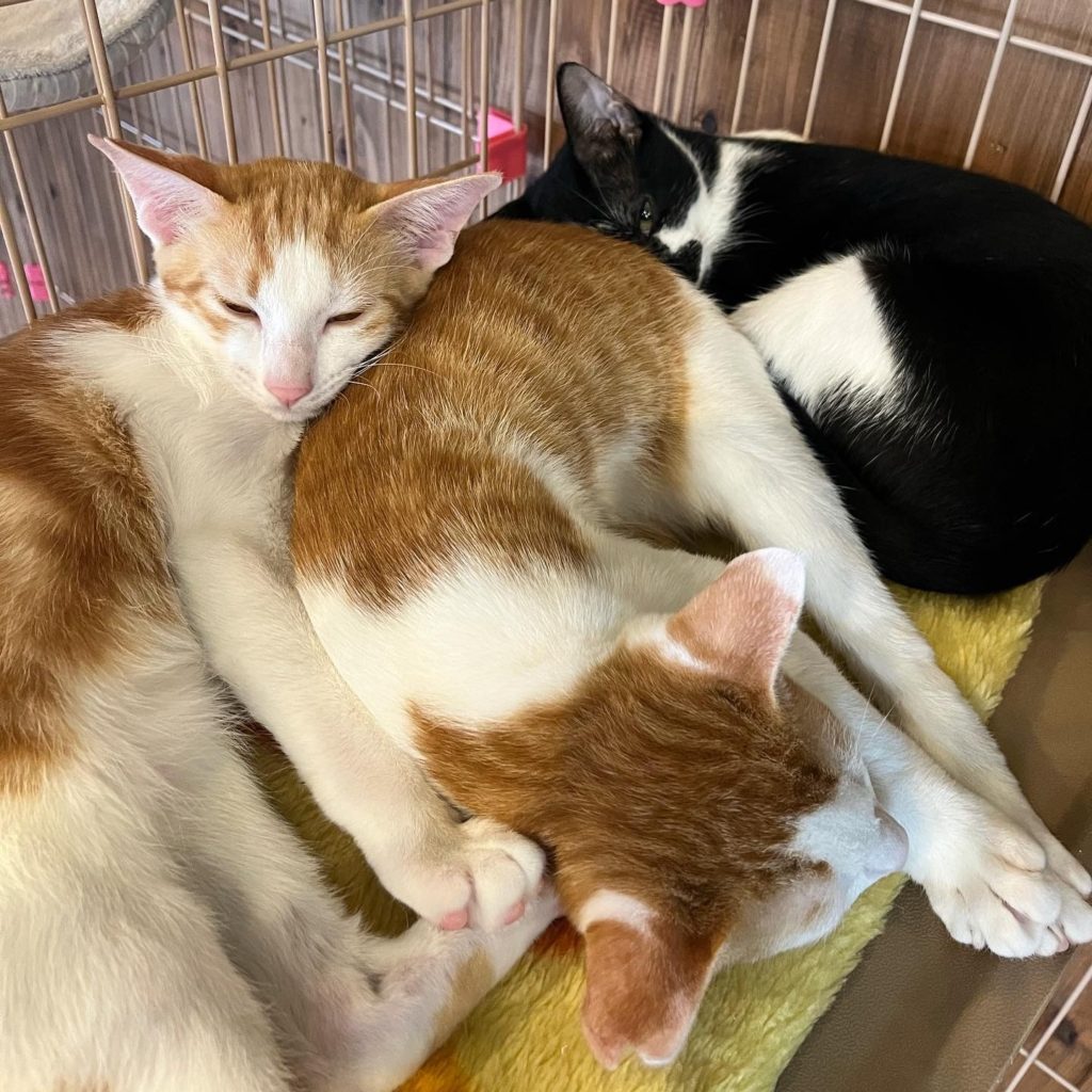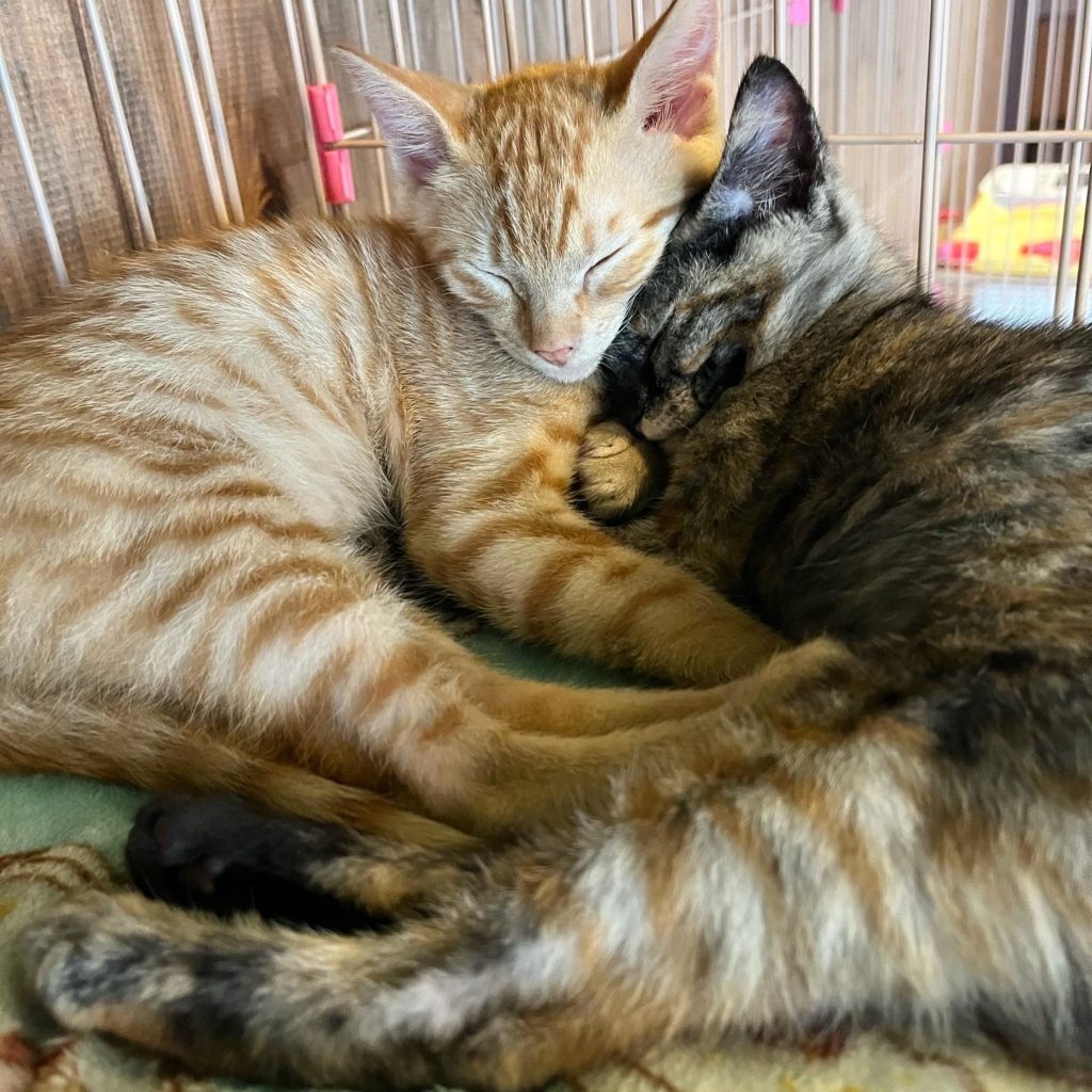 現在、すーにゃんには仔猫のにゃんスタッフが5名います。2名と3名の二組の兄弟たちです。むぎときなこの男の子、女の子兄妹。びさく、ちゃぼ、そして、ひげ丸の男の子ばっかりの3兄弟。子猫たちがケージから出てくると、一緒に遊ぼうと思っているのか?よく動く猫じゃらしと思っているのか?いつもだらだら寝ている大人のにゃんスタッフも活気づきます。仔猫たちは怖いもの知らずで色々な大人のスタッフのそばに寄っていっては、じゃれついたり噛みついたり、やりたい放題です(;^_^A でも、成猫同士であれば喧嘩に発展しそうな場面でも、そこは相手が仔猫であることを本能的に理解しているのでしょうか、子猫たちにはお咎め無しなんですよね。仔猫たちの成長は速いです。よく遊び、よく食べ、よく寝るこの時期を大切にしてあげたいと思います。