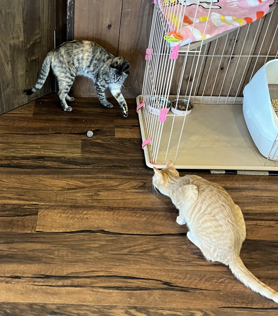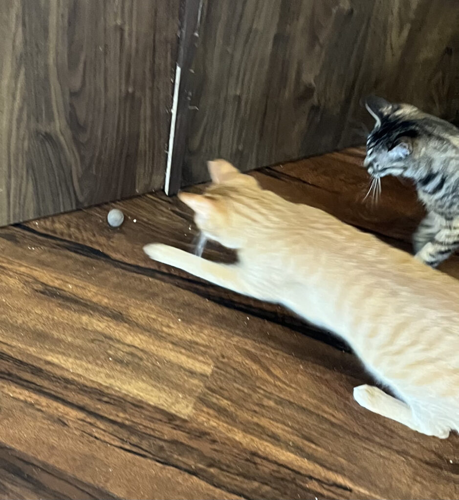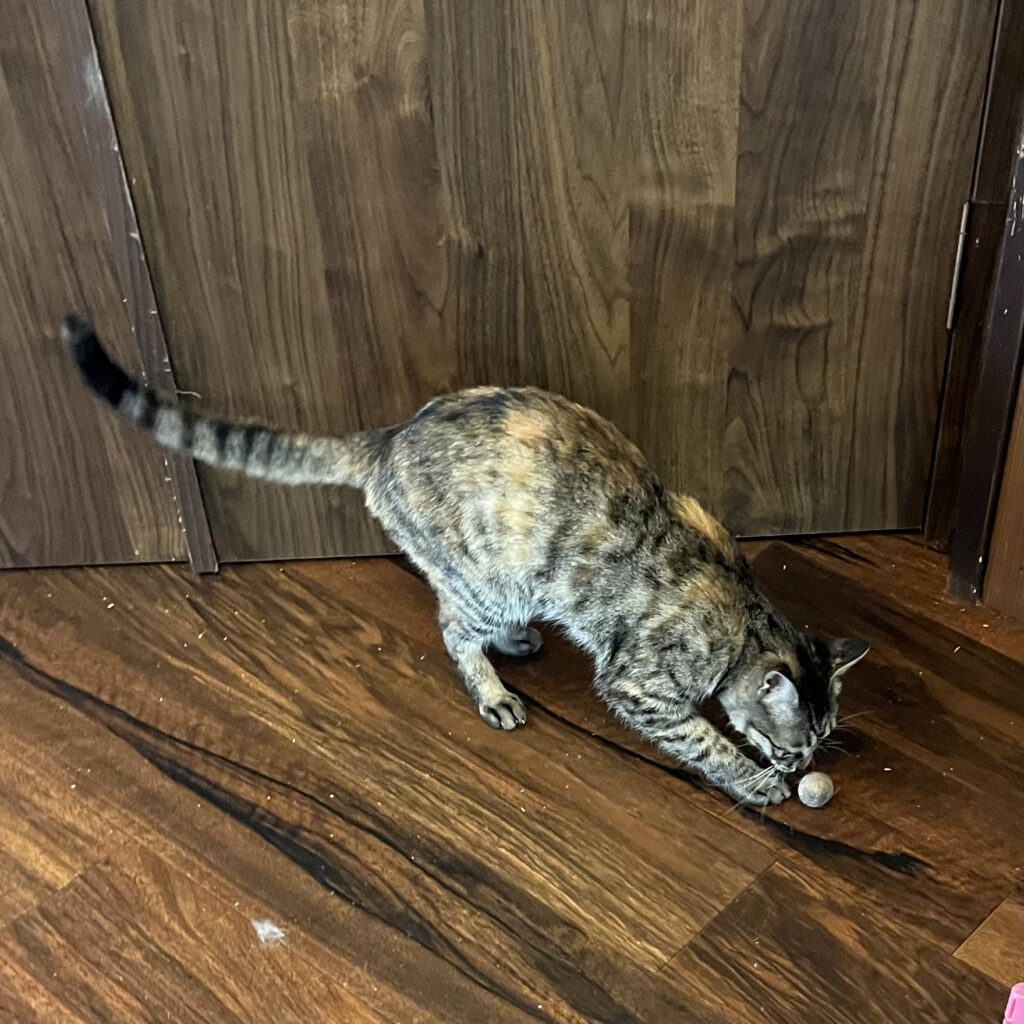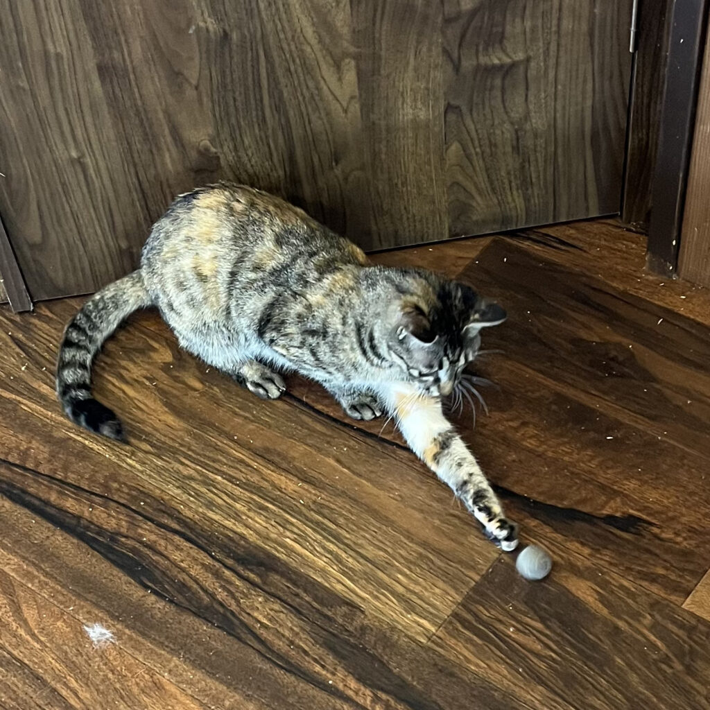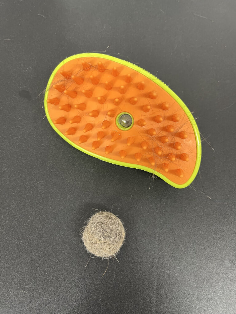 そろそろ換毛期という事でブラッシングをしました。まぁ、抜ける事抜ける事😅キリがありません。これを飲み込んだらと思うと恐ろしい😥つよしがブラッシングの間中ついて回っていました。目的は毛玉ボール🟤。ちょっと大きめの毛玉ボールが出来たので少し遊んでもらいました。
