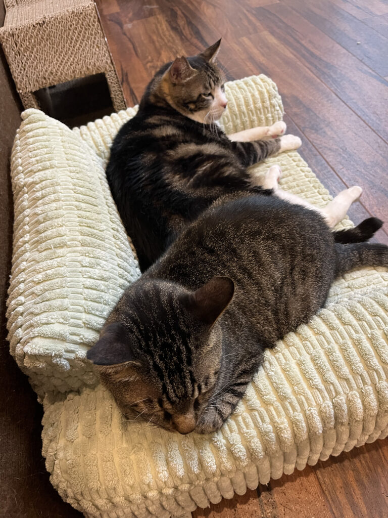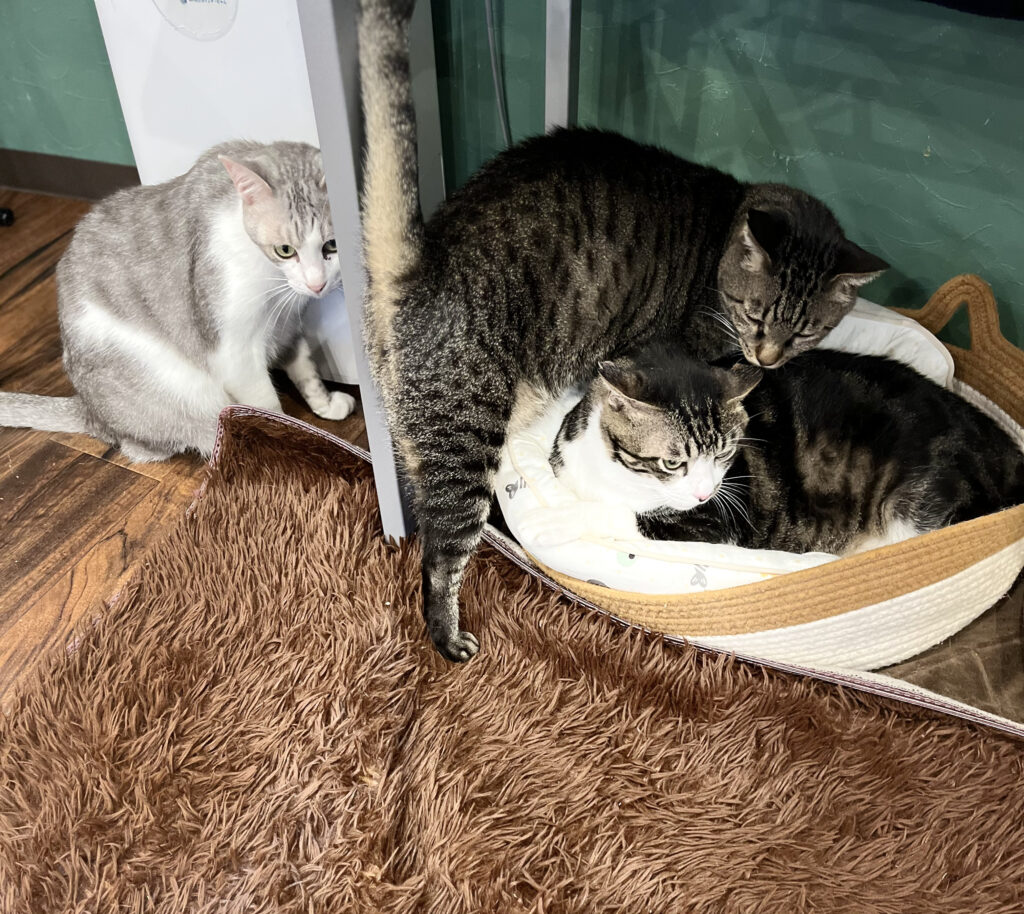 おやつの時はすこぶるアグレッシブなきゅうですが普段はおとなしめ。そのせいか、ゴルゴやれいじに追いかけまわされる事も💦先日はニコにまで追いかけられていました😅シンバ大好きでストーカー並みにくっついていてもシンバが助けてくれることは無いんですよね~。シンバには振られっぱなしのきゅうですが他の子には甘えられがち。タフィは特にきゅうが大好き。一緒のベッドでグルーミングしてもらうこともあります。きゅうは来るもの拒まずなので甘えられたら誰にでも優しくグルーミングしてあげます。