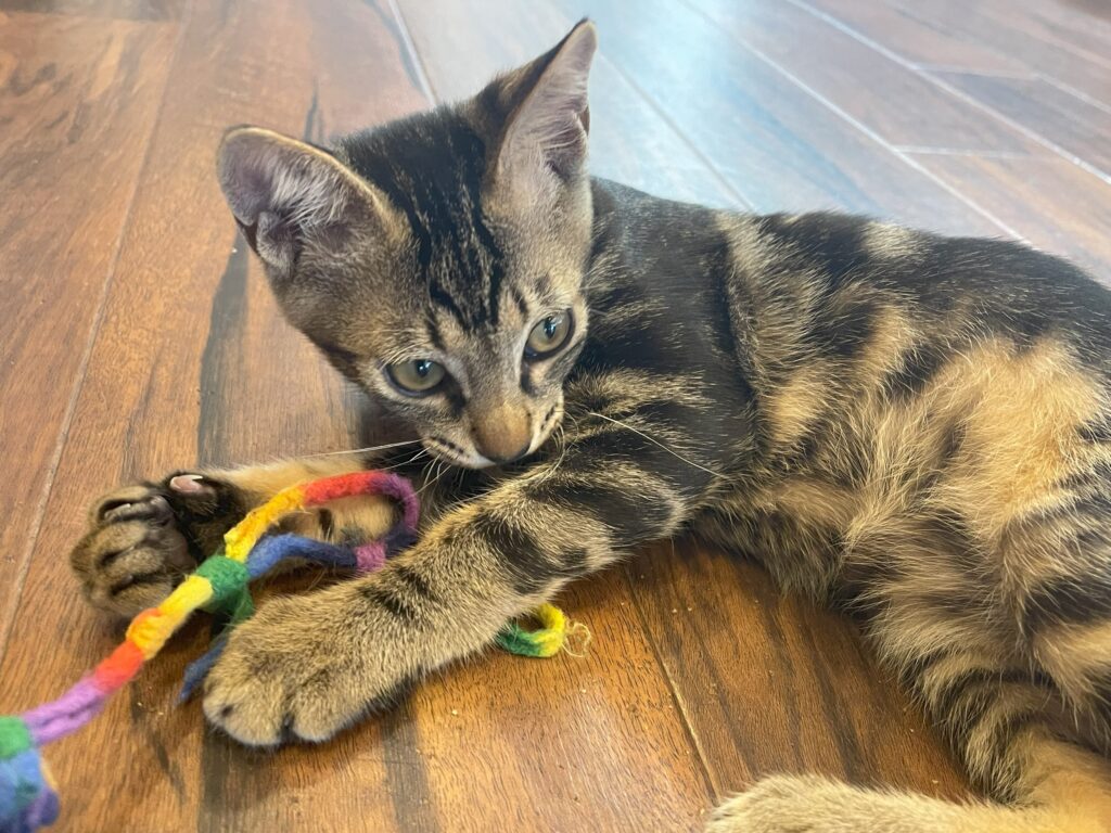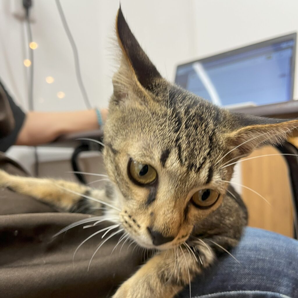さくはそうの兄弟。そうより4日遅れてすーにゃんにやってきました。一緒になった途端に兄弟でじゃれあって遊んでいました。ケージの外に出ると鬼ごっこやプロレスごっこ。兄弟重なって寝ているところはとても可愛らしかったです。さくは、猫じゃらしやボールなどおもちゃには執着心が強いのか(?)、自分が手に入れると他の子に取られるのを嫌がって「う~~~!!」と唸り声をあげます。でも、スタッフが取り上げても噛んだり、引っ掻いたりはしません。そうと同じくケージの外ではずっと遊びっぱなしなので時々休憩させますが、さくは疲れてコテンと寝てしまいます。さくもとても甘えたで足元に来て「抱っこ~」と訴えてくることもあります。スタッフの肩にまで登って髪の毛をくちゃくちゃに毛づくろい(?)してくれます🤣