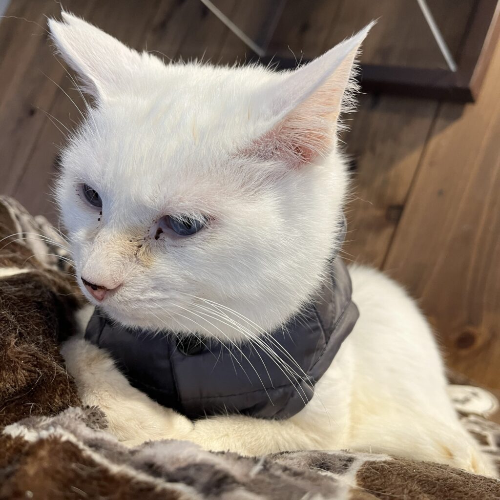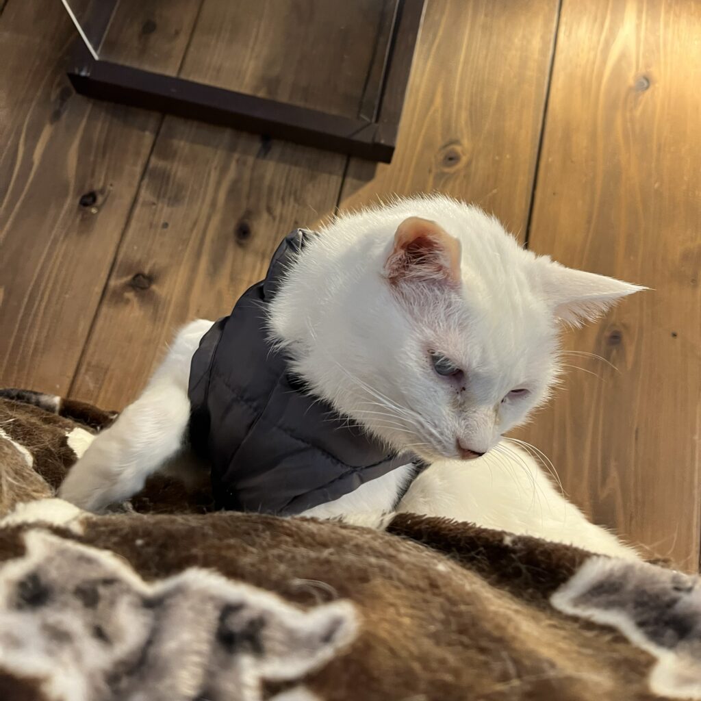 風邪でお薬を飲んでいたさくら。風邪はおさまったのですが、その頃から胸元に禿げが・・・。よく観察してみるとグルーミングの時に掻いて悪化させている様子。折角、傷が治りかかたところをまた掻いてしまっているようでした。苦肉の策で服を着せてみたところ思いのほか可愛くなりました。ニコは「何者!」という感じで警戒してしっぽを膨らましています🤣他のニャンスタッフたちも怪訝な顔😂😂😂