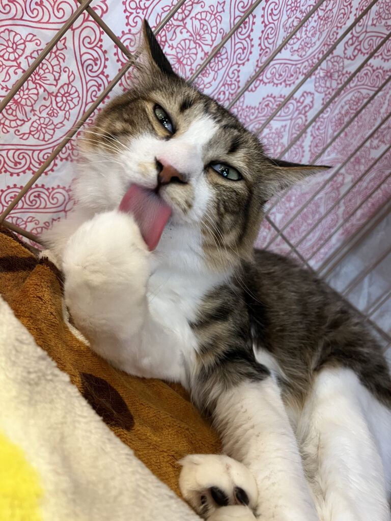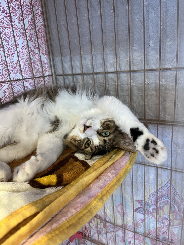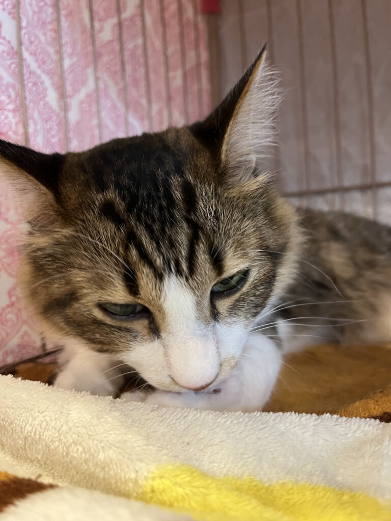 すーにゃんに来て2週間がたったもんじろう。従来であれば、そろそろケージから出てもいいのかなぁという感じなのですが先日から鼻炎を発症し、ただいまお薬を飲んでいます。鼻が詰まったりしてご機嫌の悪いときもあり、まだもう少しケージで我慢してもらわないといけない感じです。最初すーにゃんに来た頃は結構「出して出して」という感じでしたが、最近はちょっと諦めモードです。お薬がんばって飲んで早くお外デビューしようね。(お客様の居ない時は短い時間で少し出てはいます。)