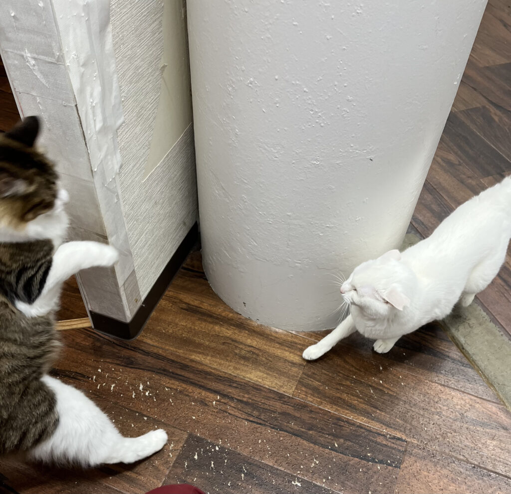 鼻炎のお薬も終わりケージから解放されたもんじろう。あちこちを探索したり先輩猫にちょっかいをだしたり本領を発揮しはじめました。走り回るのが好きなようで通り過ぎざまに先輩猫にパンチを🤜🏻食らわせたり💦一番小さいニコを追いかけまわしたりと元気いっぱいです😅。ただ、その騒がしさに我慢ができないのはリリ。あまり、バタバタするとリリに追いかけられて怒られしゅん😿としてしまうもんじろうでした。