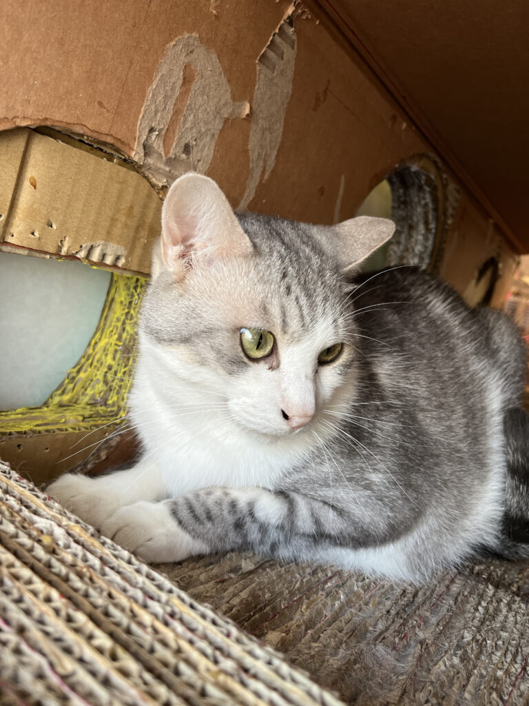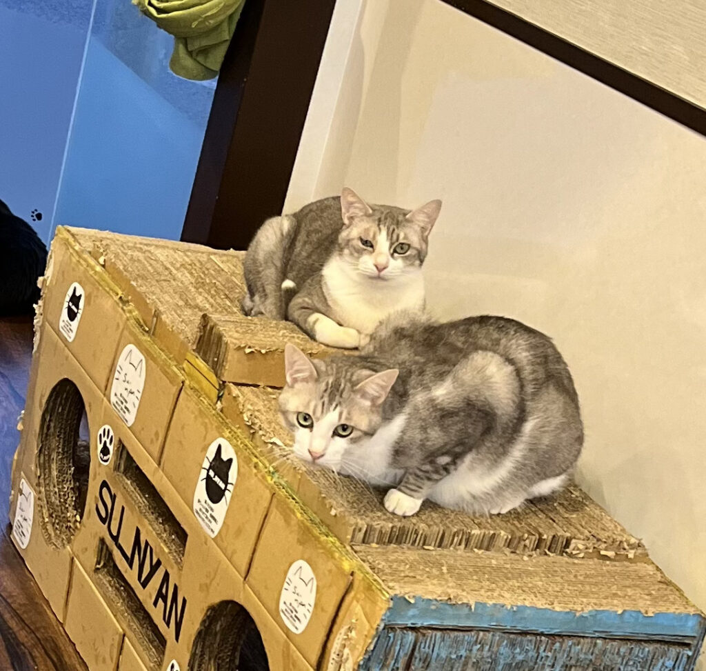 トムよりは社交性がある(?)タフィーは他のニャンスタッフたちとも関わることが多いです。特にきゅうにはご執心でゴロゴロと甘えてグルーミングをねだります。きゅうがシンバについて行くときは一緒に移動する事も度々🤭お付きのようにシンバの後をついて行きます。おやつが出ると前にいる子にパンチとくらわしたり、時には兄弟のトムにマウンティングすることもあります。トントンは好きなので「にゃお~ん」とないては横になりおねだり。もっと真ん中に出てきてほしいんだけどなぁ😓😓