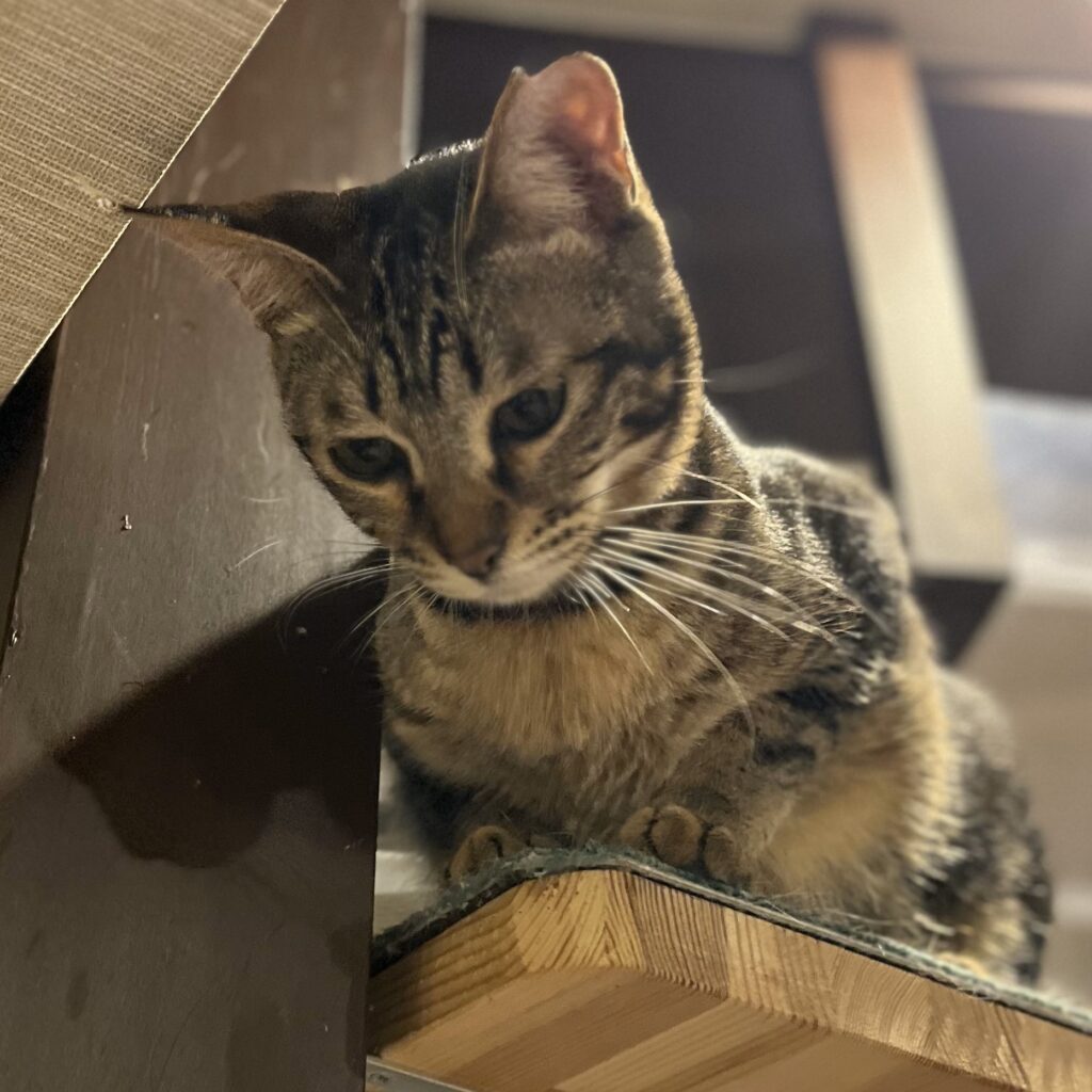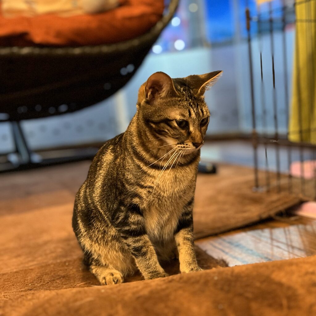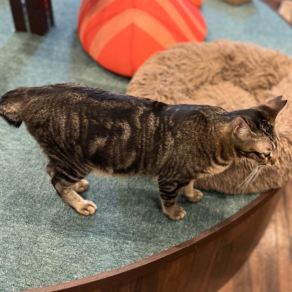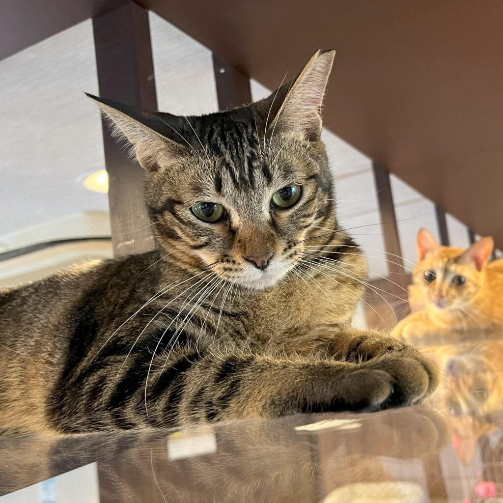 5月に新入りにゃんことしてご紹介した「ディオール」。ちょっぴり気の強い女の子。黒猫の「ナイキ」とは兄妹です。お昼はバックヤードで寝ていることが多いです💦が、夕方になると出てきて店内を走り回っています。食いしん坊で、おやつが出るとバックヤードからいそいそと出てきておねだりします。ニャンスタッフよりも人が大好き。撫でるとゴロゴロ喉を鳴らして甘えてきます。なでなでしながら名前を呼ぶと「にゃ~」とかわいく返事をしてくれます。