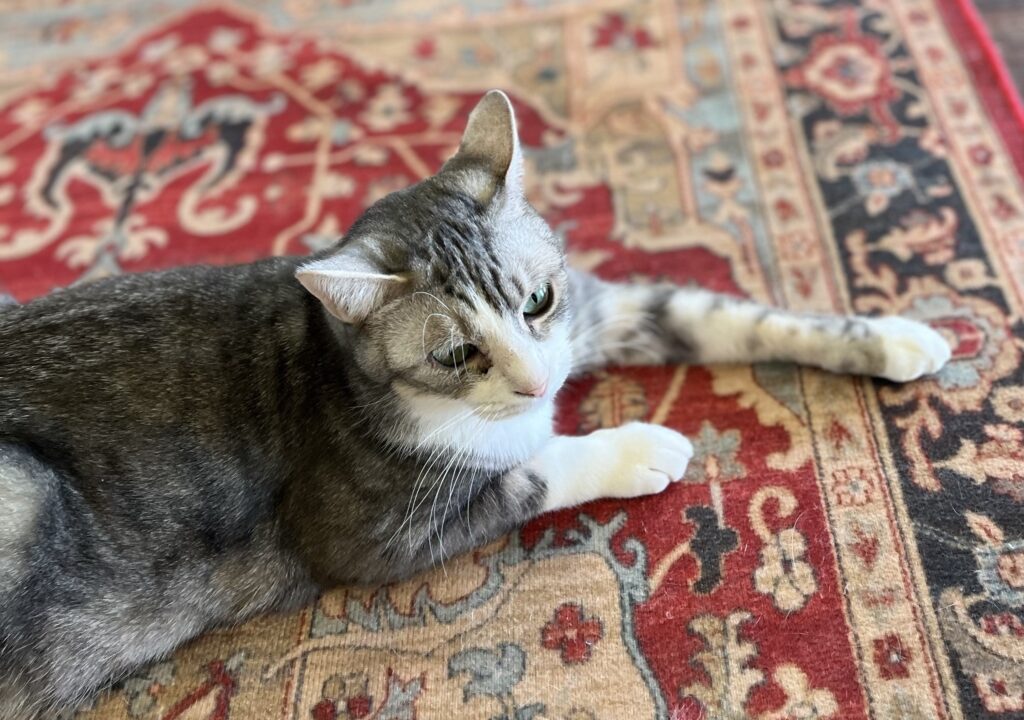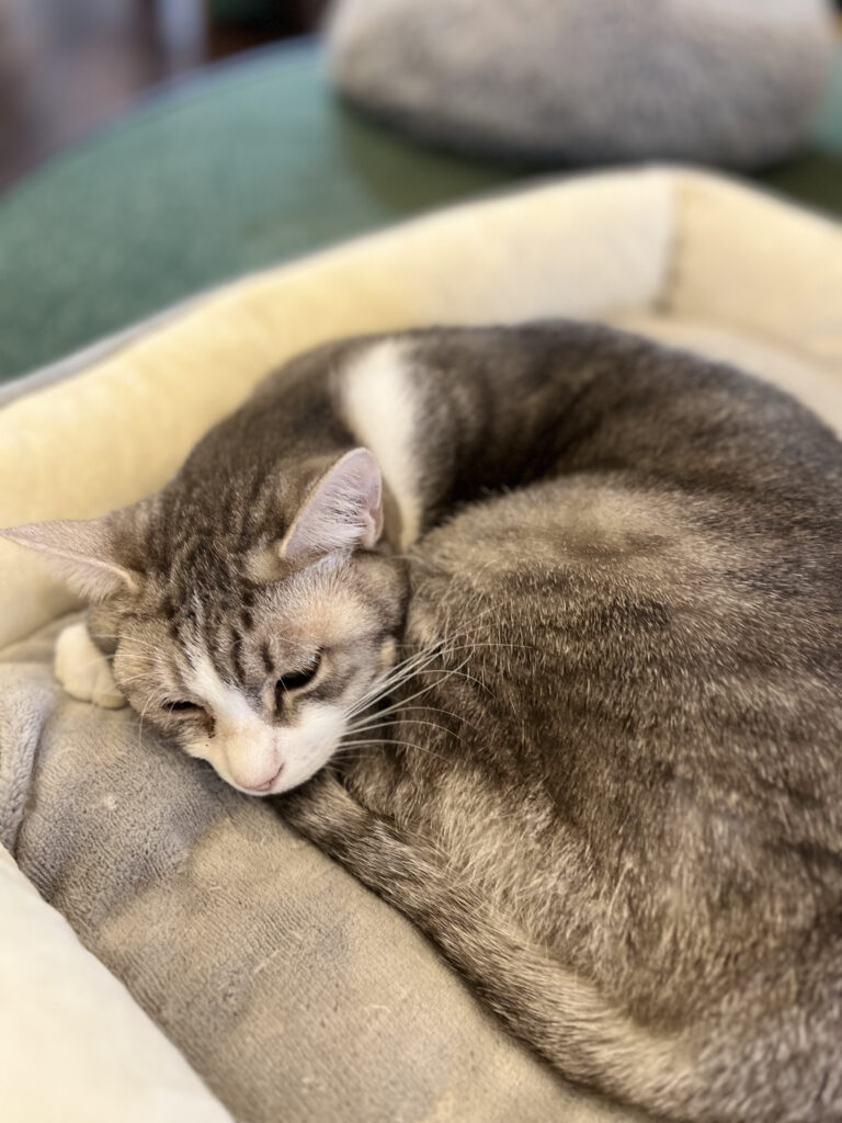 兄弟猫のトムとタフィー。サバ白の綺麗な柄で人気も高いのですがなんせ人嫌いの怖がり。すーにゃんにやってきて2年以上もたつのに相変わらず逃げてばかりいました。これはもう「家野良猫(飼い猫なのに警戒心が強く人になつかない猫)」に一直線だなぁと思っていました。ところが3年目に入る頃、急に気を許したのか触れるようになったのです。まずは、タフィーがトントンを要求するようになり、そのあとトムもトントン出来るようになりました。半分諦めていたので驚きと嬉しさでいっぱいになりました。いまでは、お客様にも撫でて頂けるようになり成長したなぁと感慨深くなりますね。そんなトムとタフィーにみなさんも会いにいらしてみては?