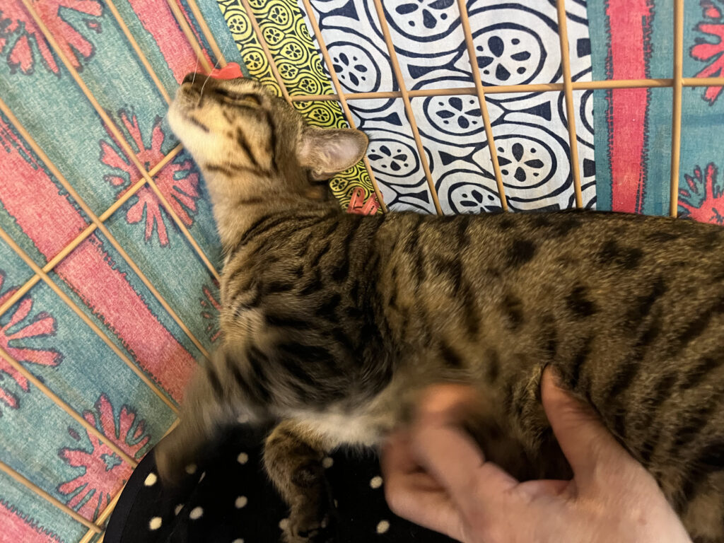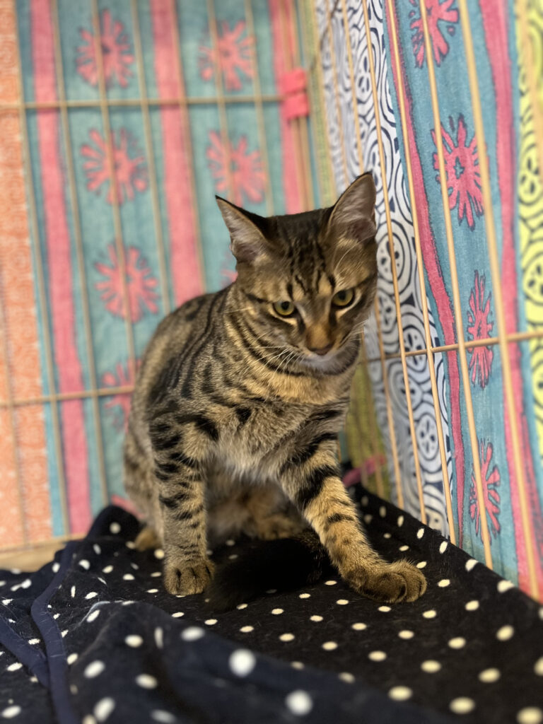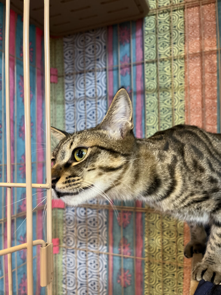 10月の中頃にナミ、ニコと一緒にすーにゃんにやってきたルフィ。入店当初は人が怖くて仕方なく、ケージを覗くだけで「シャー!!」の連発。扉を開けようものならすごい勢いでパンチが飛んできました。掃除をしている間もケージの中を忍者のように飛び回って逃げまどい、どうなる事かと心配でした。入店してから2ヶ月近くたちそんなルフィもしっかり人馴れしてきました。なでなでは平気になり時にはお腹を出すことも。この頃はケージの外で遊びたくて、先輩ニャンスタッフ達がお客様と遊んでもらっていると「出してにゃ~」とおねだり鳴きをします。もう少ししたらみんなと一緒にあそぼうね💕