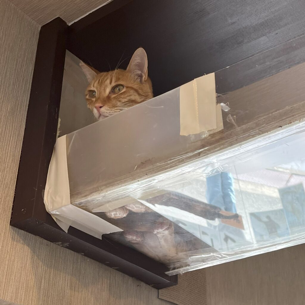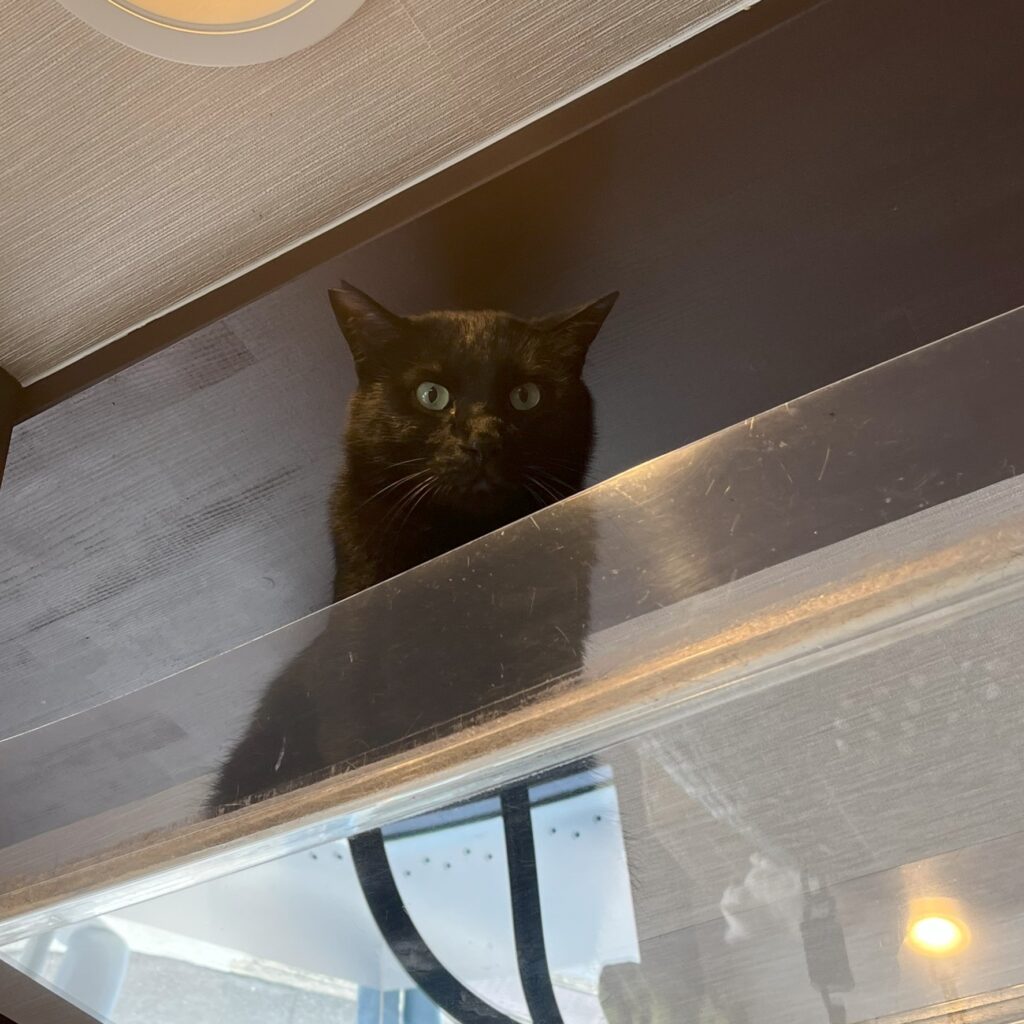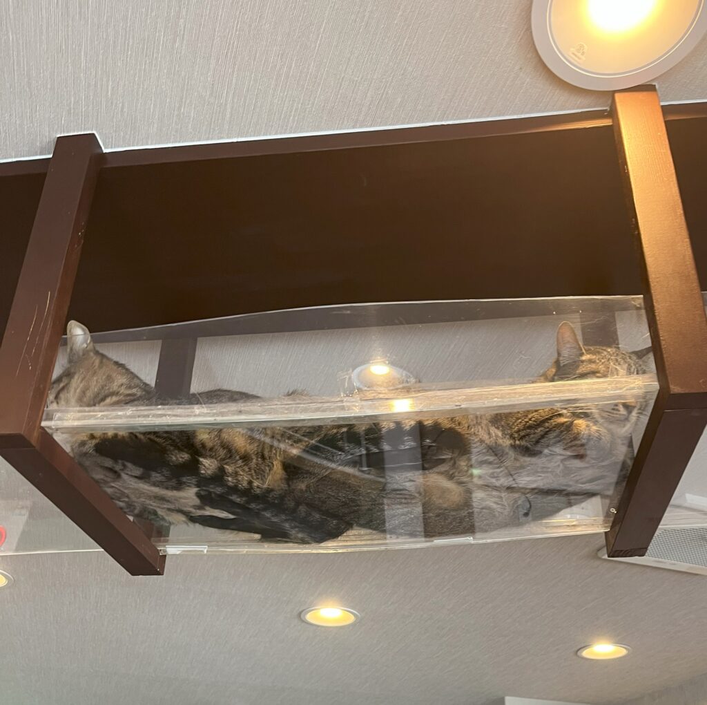 今日は店休日。大掃除とニャンスタッフたちのリフレッシュの日。午前中は「オリーブ」さんのスタッフにも来ていただいて大掃除。毎回の事ですが、掃除機の大きな音やたくさんの人を避けるためにキャットウォークに避難するニャンスタッフたち。掃除か終わるとじわじわと降りてきます😅😅この後は、いつものカリカリにパウチを混ぜる特別ごはん「もぐもぐタイム」でニャンスタッフたちの気分を和らげます。待っててね~💖