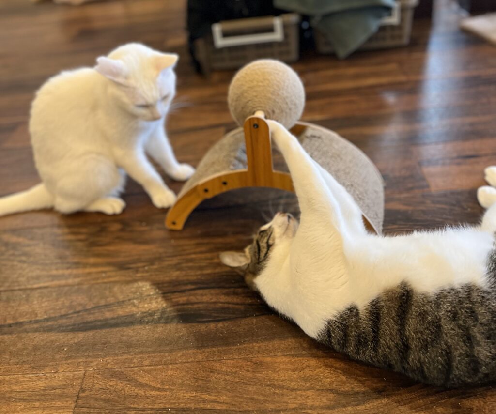 猫は、単独で行動し個々の縄張りを持って暮らしています。その為、自分の縄張りを主張するために「マーキング」を行います。頬やあごのあたりに分泌腺があり、飼い主さんが外出から帰ってくると、足などにスリスリするのは自分のニオイをつけて「この人は私の(ぼくの)もの💕」と主張して安心しているのではないかと言われています。また、肉球からもにおいをだしていて、爪とぎをすることで自分の存在をアピールしているのだそうです。これらのマーキングは、どちらかといえば、気分が落ち着いていたり、盛り上がっている時に行われるものですが、他にも「スプレー」といわれるマーキングもあります。これは、普段のおしっこと違いニオイの強いおしっこを壁などにかける行為です。発情期に女の子を引き付けるための行動で、主に去勢していない男の子がすると言われていますが、去勢した男の子や女の子がすることもあります。こちらは、環境の変化に対する不安や生活環境に不満がある時に頻繁にするようです。当店でも、トライアルで古いニャンスタッフが出て行った後に新しいニャンスタッフが入って来た時などにスプレーをする子が増え、洗濯と掃除に追われることがよくあります😭 スプレーが気になる時は周りの環境を見直してあげてみてください。(参考:ペットライン 猫ノート)