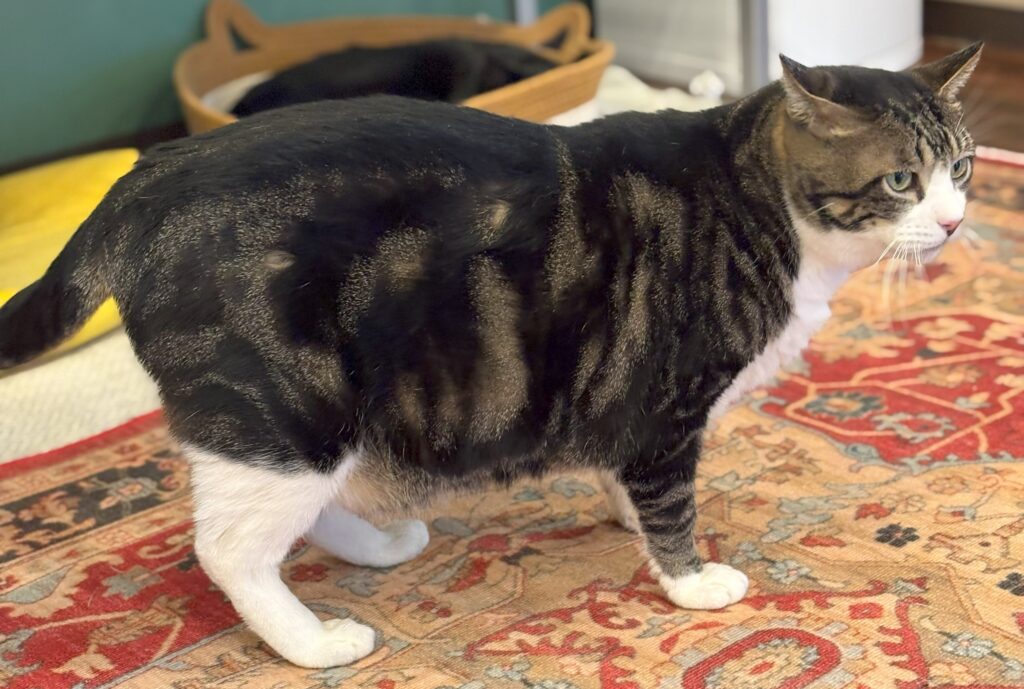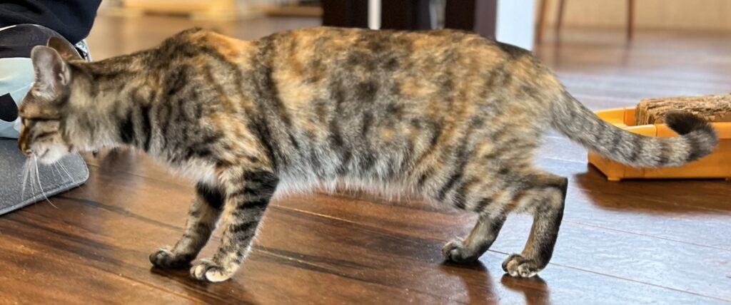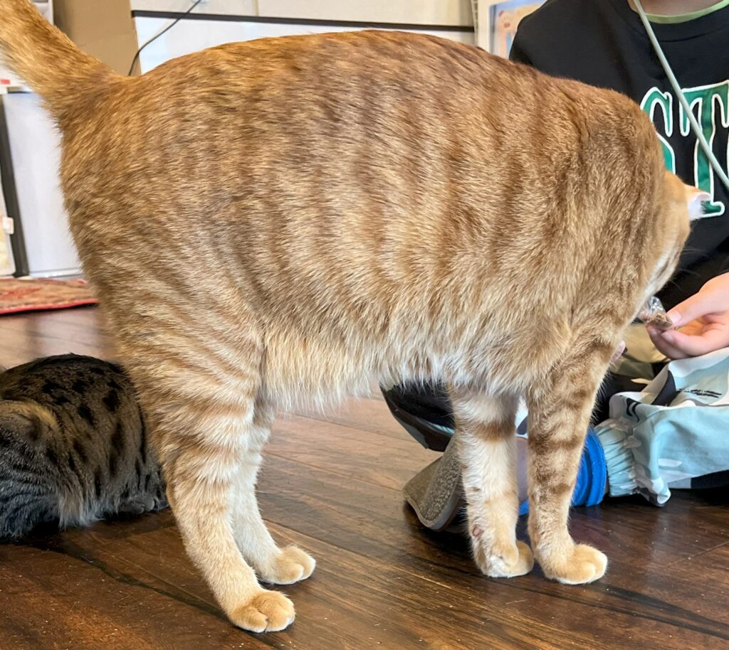 歩くとゆらゆら揺れるお腹。「肥満?」と心配になりますよね。(って私の事ではありませんよ!)大丈夫です。猫ちゃんのお腹から後ろ足の付け根にかけてのたるみは脂肪ではなく皮なんです。プライモーディアルポーチ(ルーズスキンとも言います)と言ってきちんとした役割があります。ライオンやトラなどのネコ科の動物にもあるんです。このプライモーディアルポーチは、猫同士のけんかや外敵に襲われた時に、急所であるお腹を噛まれた場合でも皮が伸びていることで、内臓を守り致命傷を負わないためにあると考えられています。また、猫のジャンプ力は高く猫自身の体高の約5倍の高さをジャンプするといわれ、瞬発力は本気を出すと時速約50kmで走れるといわれています。プライモーディアルポーチは、このような能力を最大限に発揮できるよう、体が急激に大きく動いた時に皮がつっぱらないようにあるとも考えられています。さらには、食べられるときにたくさん食べておけるように余裕があるともいわれています。お腹のたるみは、子猫にはなく、成猫に成長するにつれてたるんでくるようです。肥満かどうかの確認はお腹周辺を触ってみて、たるんでいる部分をつまんでみたときに、柔らかい皮膚のみが触れる場合は大丈夫です。やや厚みがあり皮膚の下にぷよぷよとした触感がある場合は肥満の可能性が大きいです。また、何か硬い感触がある場合は、腫瘍や炎症によって「しこり」ができている可能性がありますので、動物病院を受診しておくと安心ですね。(参考:ひだまり動物病院・ipet)