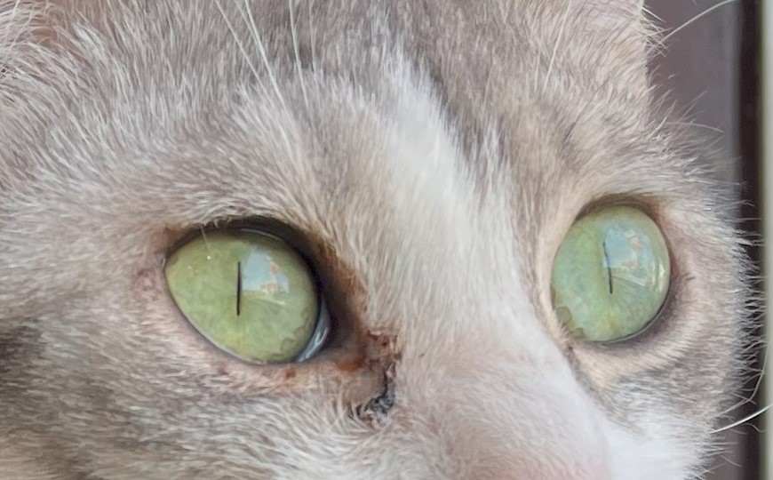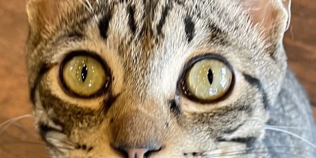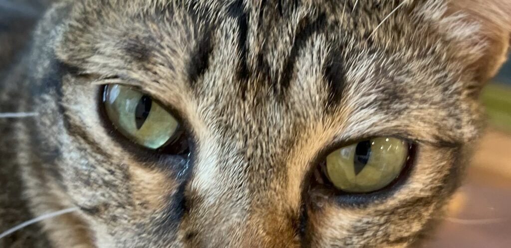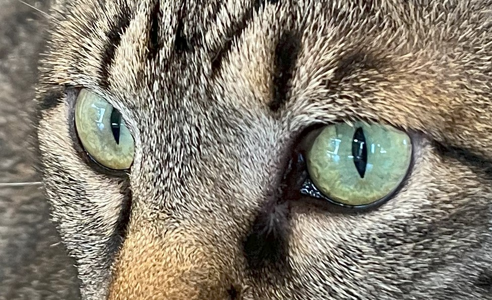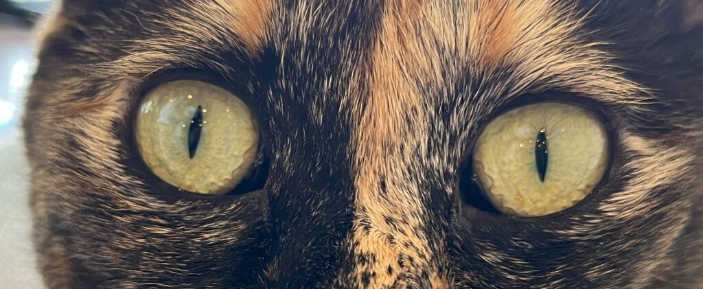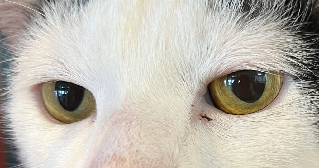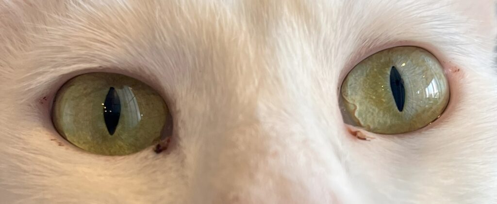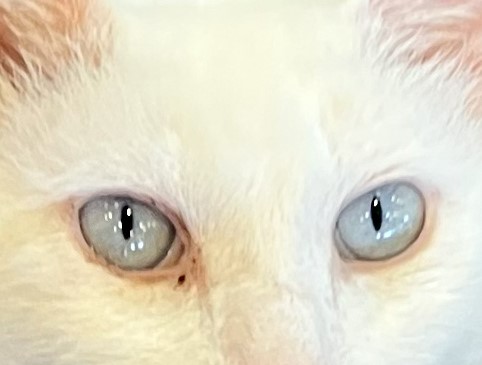猫の目を見ていると、すいこまれそうな綺麗な目をしていますよね。生まれて2ヶ月くらいまでの仔猫は、灰色がかった青い目をしていて「キトンブルー」と呼ばれています。6カ月から8ヶ月で本来の目の色に変わっていくので仔猫の時だけの特別な色と言えます。猫の目の色はメラミン色素の量で違ってくると言われていて、大人の猫の目の色は5色くらいに分かれています。赤みを帯びた茶色の目の色は「カッパー(オレンジ)」、透明感のある琥珀色の目は「アンバー(ゴールド・イエロー)」、外側がイエローや薄いブラウンというように2色のグラデーションがかかった目の色「ヘーゼル」そして「グリーン」、「ブルー(サファイアブルー・アクア)」です。ブルーの目は白猫によく見られます。当店に居るアクアもその名の通りアクアブルーの綺麗な目をしていますよ。更に、左右の目の色が違う「オッドアイ」、一つの目が2色に分かれている「ダイクロイックアイ」。オッドアイやダイクロイックアイは、虹彩異色症という先天的な遺伝子異常が原因と考えられており、青い目側の耳に聴覚障害が起こる場合が多いといわれています。