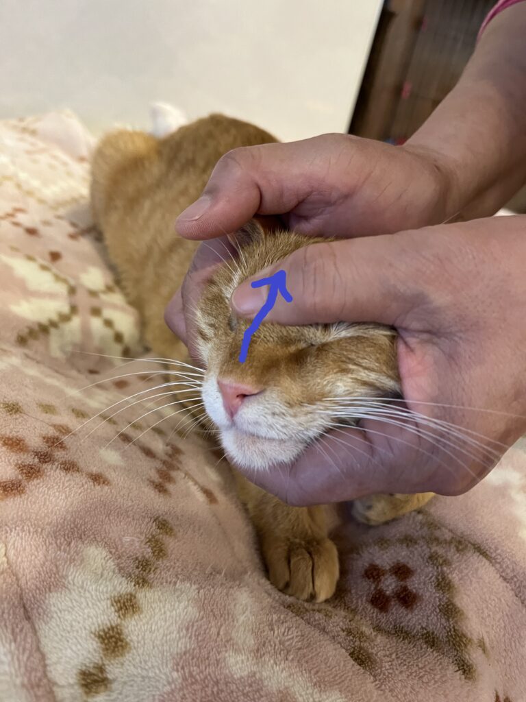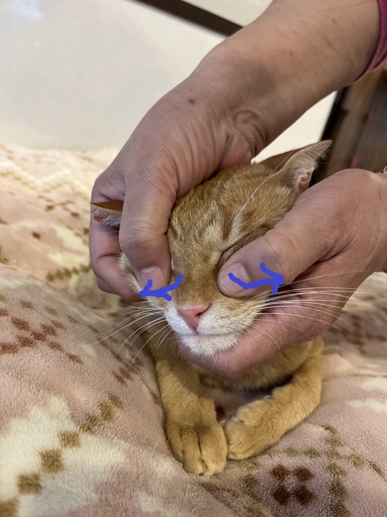 ①目ヤニや涙目には、上瞼に親指をおき頭から目尻の方向へさすります。下瞼も同様に。