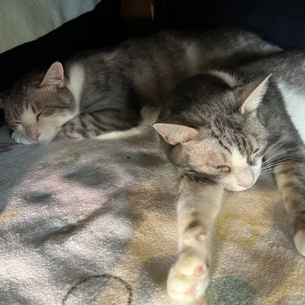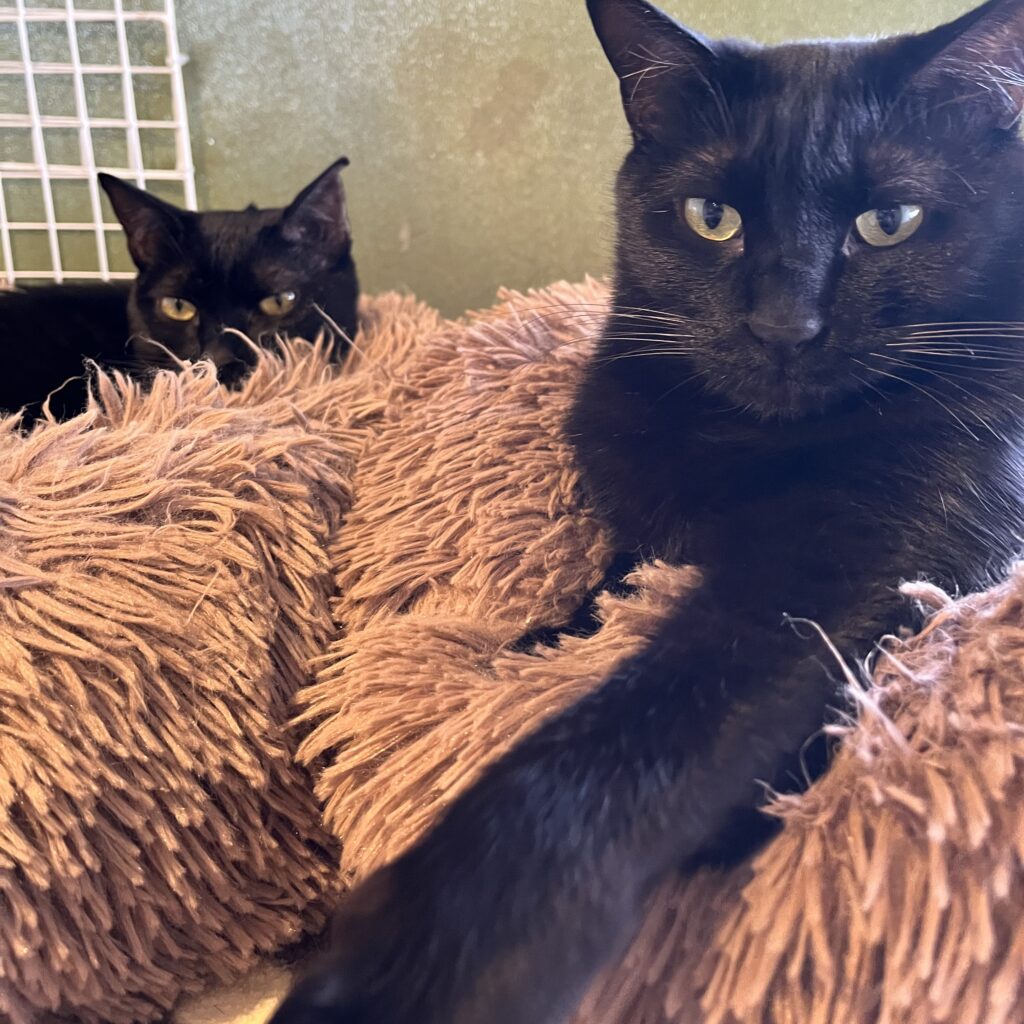 同じ毛色の猫は仲良しになりやすいのでしょうか?すーにゃんの子で同じ毛色の子はほとんど兄弟なので仲が良いですが、他の子はどうなのかなぁと気になりました。調べた結果は「No」でした😅同じ毛色でも性格が違えば仲が悪いし、気が合えば違う毛色でも仲良しになります。ただ、黒猫同士は比較的仲良くなりやすいようです。 黒猫は元々「人懐っこい甘えん坊」気質で他の猫や人間とも仲良くできる性格の子が多く、黒猫同士は特に仲良くなりやすいようです。もみじとはいつもにらみ合っているゴルゴもハムは優しく遊びに誘っていました🤭🤭🤭