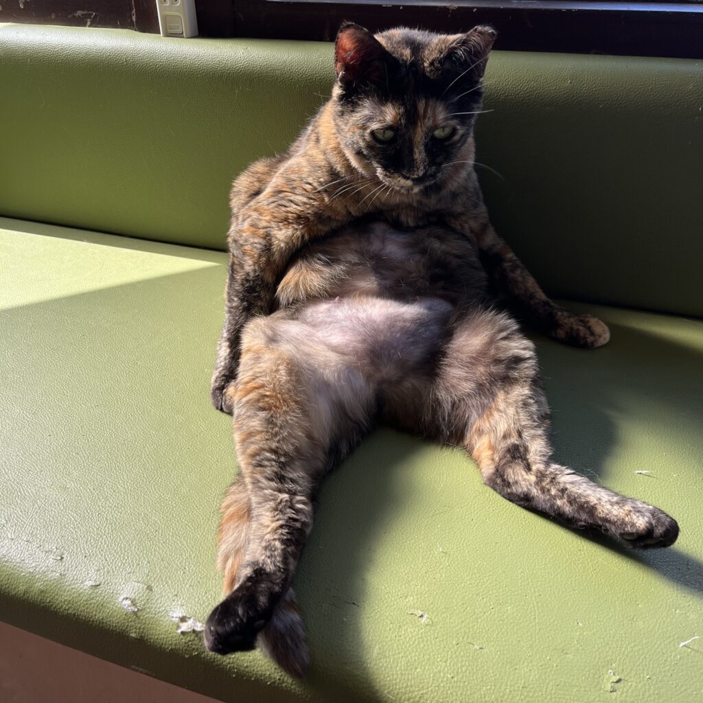 リラックス度が高いのは、「香箱座り」(前足と後足を折りたたんで体の下にしまう座り方)や、「スコ座り(おっさん座り)」(お腹を出して後足を放り出す座り方)です。スコ座りという呼び方の由来は、スコティッシュフォールドがよくする座り方だから😆。それよりも少しリラックス度が下がるのが「横座り」(横向きに寝転がって後ろ足を伸ばす座り方)。上半身を起こし下半身だけ力を抜いている場合は、すぐに動けるようにと少し警戒している座り方です。更に警戒心が強い座り方は、「スフィンクス座り」(エジプトのスフィンクス像が由来で、肘を床につけて前足を前に突き出し、凛と胸を張っている座り方)や「エジプト座り」(前足を立てたまま後ろ足を曲げて腰を下ろした座り方)。これらの座り方をしているのは少し警戒の気持ちがあるときで、危険や異変を察知したらすぐに動ける状態をキープしているといわれます。一番警戒心が強い座り方は、「しっぽ巻き座り」(エジプト座りの姿勢のまま、しっぽを体に巻きつけた状態)。この座り方の時は、油断大敵といわんばかりに前向きに揃えた足でしっかりと床を踏みしめながら、しっぽの先まで神経をとがらせていることが多く、隙を見せないようにできるだけ安全な姿勢を保っている状態なのだそうです。(参考:となりのカインズさん)
