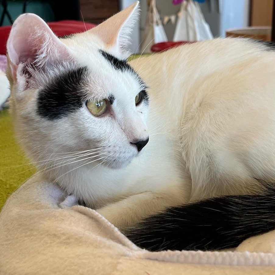白猫と反対で目立たない柄のため、ミステリアスな外見とは裏腹に穏やかで楽観的。争いを好まず、友好的な性格です。(モデル:きいろちゃん)