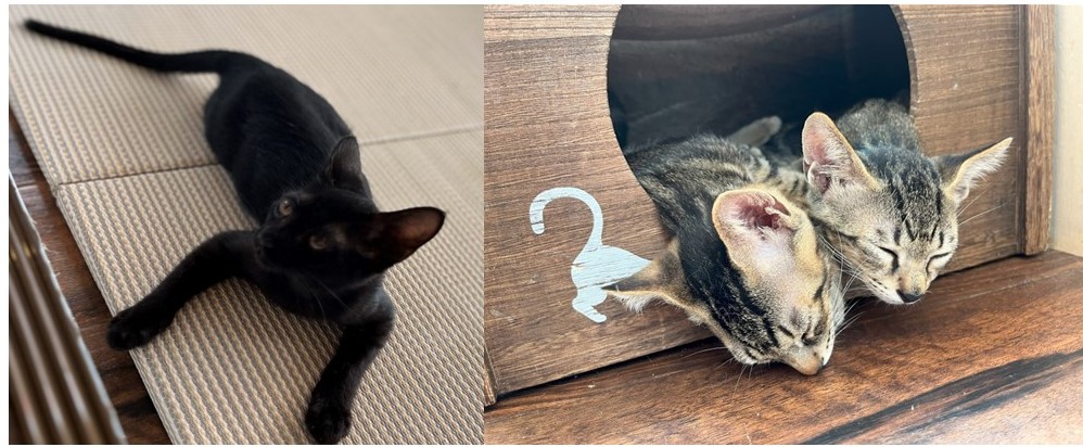 すーにゃんには、今、3匹の仔ニャンスタッフがいます。4ヶ月の黒猫の女の子「クローバー」と3ヶ月のキジトラの兄弟の「そう」「さく」。3匹ともとても元気で、開店と... -