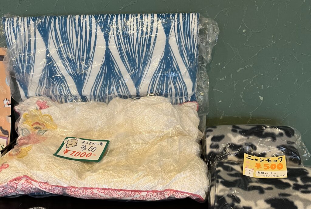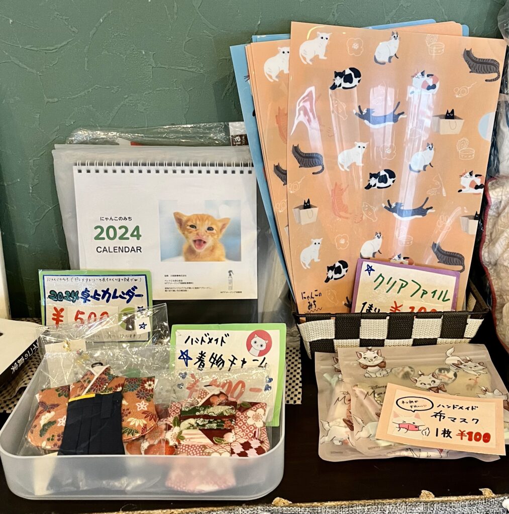 すーにゃんでは、猫をモチーフにしたアクセサリーや猫用のハンモック、ニャンスタッフ達の缶バッチなどのグッズも販売しております。売上は、全てニャンスタッフ達の病院代やご飯代など保護猫活動に使わせていただいております。ご来店の際は、ぜひチェックしてみてくださいませ(=^・^=)