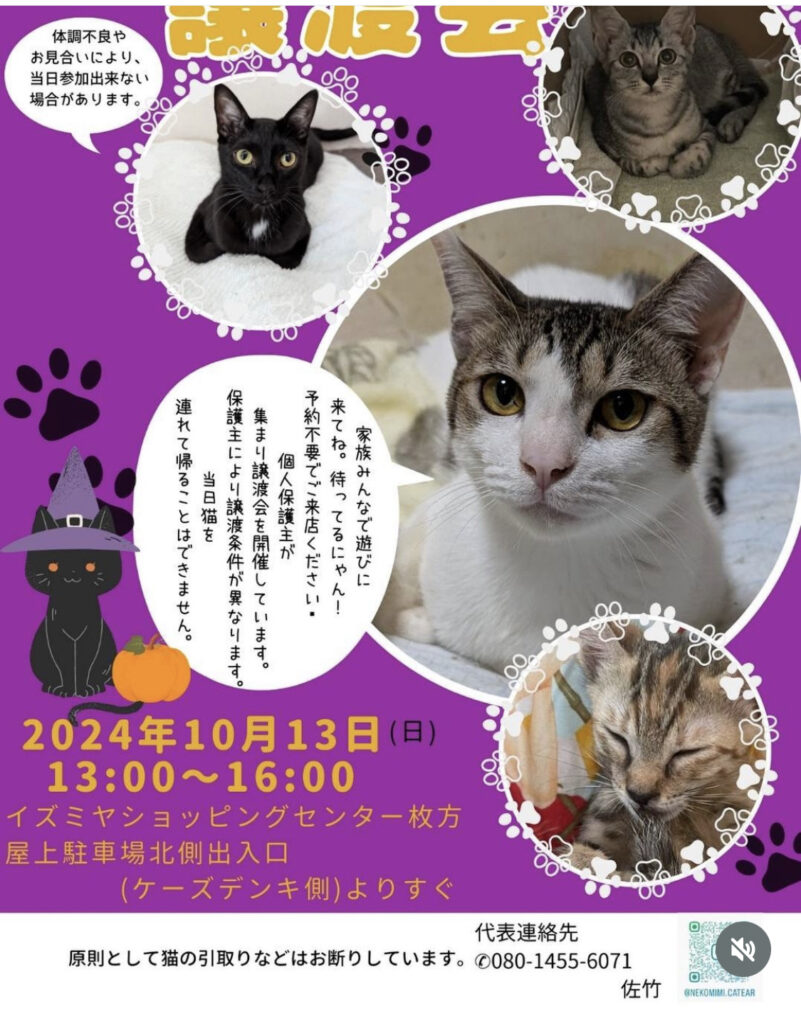 ディオール、ジュニア、れいじ、つよし、ともこの保護主さんの所の猫ちゃんたちが参加する譲渡会が明日開催されます。ずっとの家族を求めて、とても甘えん坊のニャンたちがたくさん参加します。お近くの方で保護猫をお迎えしようと考えられている方、保護猫活動に興味のある方、ただただ猫ちゃんに会いたい方もぜひ、ご参加ください(=^・^=)