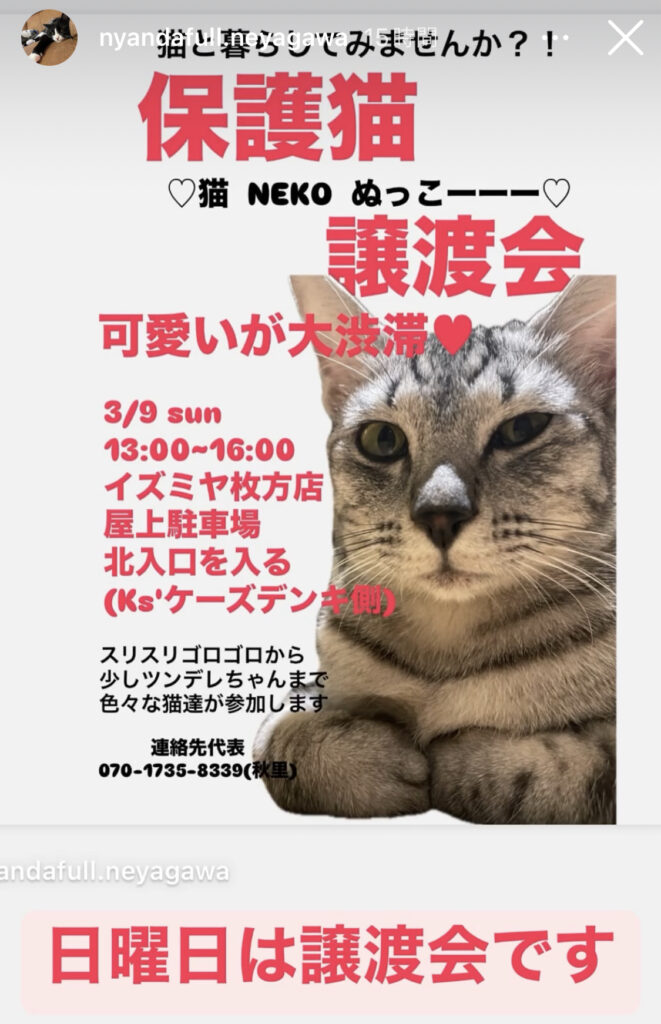 すーにゃんでお預かりしているニャンスタッフ達の保護主さんが譲渡会を開かれます。いろいろな境遇から保護された猫ちゃんたちが参加します。保護猫をお迎えしようと考えられている方、ご支援いただける方、ただ可愛いニャン子に会いたい方でも大丈夫です。お気軽にご参加ください(=^・^=)