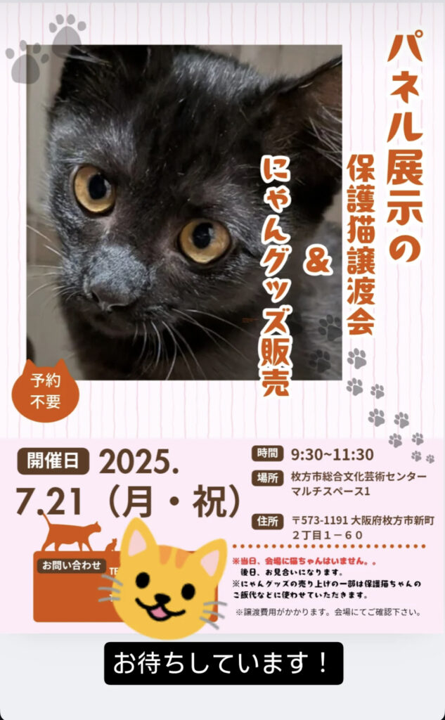 すーにゃんでお預かりしているニャンスタッフ達の保護主さんが譲渡会を開かれます。今回は、パネルを展示させていただいての譲渡会となります。当日は猫ちゃんはいませんが、保護猫をお迎えしようと考えられている方、ご支援いただける方、ご相談だけでも結構です。お気軽にご参加ください(=^・^=)