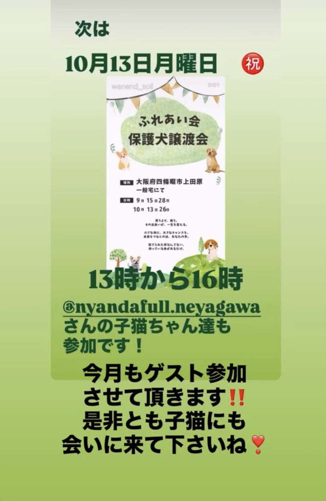 すーにゃんでお預かりしているニャンスタッフ達の保護主さんが譲渡会に参加されます。いろいろな境遇から保護された猫ちゃんたちが参加します。保護猫をお迎えしようと考えられている方、ご支援いただける方、ただ可愛いニャン子に会いたい方でも大丈夫です。お気軽にご参加ください(=^・^=)