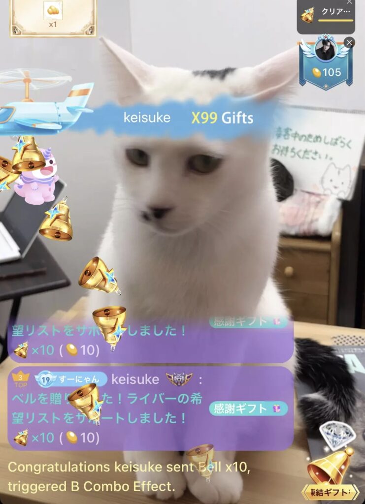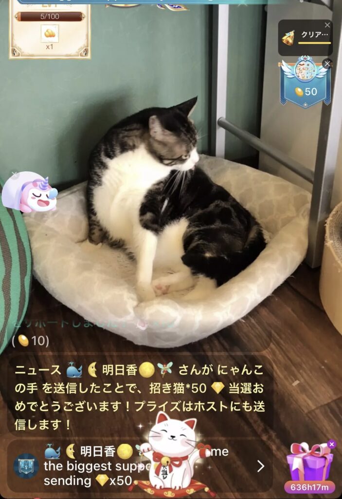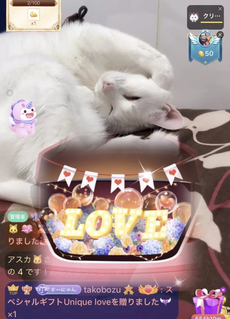 今回は、ブログの最後にご案内しているライブ配信についてお知らせしたいと思います。当店では、X(Twitter)やインスタグラムでニャンスタッフ達の様子をお伝えしていますが、どうしても写真がメインになってしまいます。写真では、なかなか普段の様子を知って頂けないので、毎日、12時頃~と18時頃~「BIGOLIVE(ビゴライブ)」というライブ配信アプリでライブ配信を行っています。ライブで店内のニャンスタッフの様子を配信しています。日々、色々な表情のニャンスタッフの様子をご覧いただけます。「BIGOLIVE(ビゴライブ)」は日本、アメリカ、ヨーロッパ、韓国、東南アジアなど世界150ヵ国でサービスを展開していて、現在、関東や東北、沖縄、北海道など日本中から配信を覗きに来てくださるリスナーさんがいらっしゃいます。海外にも多数のリスナーさんがいらっしゃって、イタリア、タイ、イギリス、アメリカ、オーストラリア、カナダ、韓国など色々な国の猫好きさん達が来てくださってコメントやギフトをくださいます。リスナーの方が投げて下さるギフトは、ニャンスタッフのご飯代や病院代にもなるので本当に助かります😭 配信の中では、ニャンスタッフ達のそれぞれの性格のお話をさせてもらったり、時にはリスナーさんからのご質問にお答えしたり、お気に入りのニャンスタッフを集中的に映してみたりと楽しい配信を行っています。里親さん希望の方、猫好きだけど猫を迎えるのが難しい方、遠方ですーにゃんに来るのが難しい方、ぜひ、ライブ配信を覗いてみてください。ニャンスタッフ達と楽しい時間をすごしましょう💕