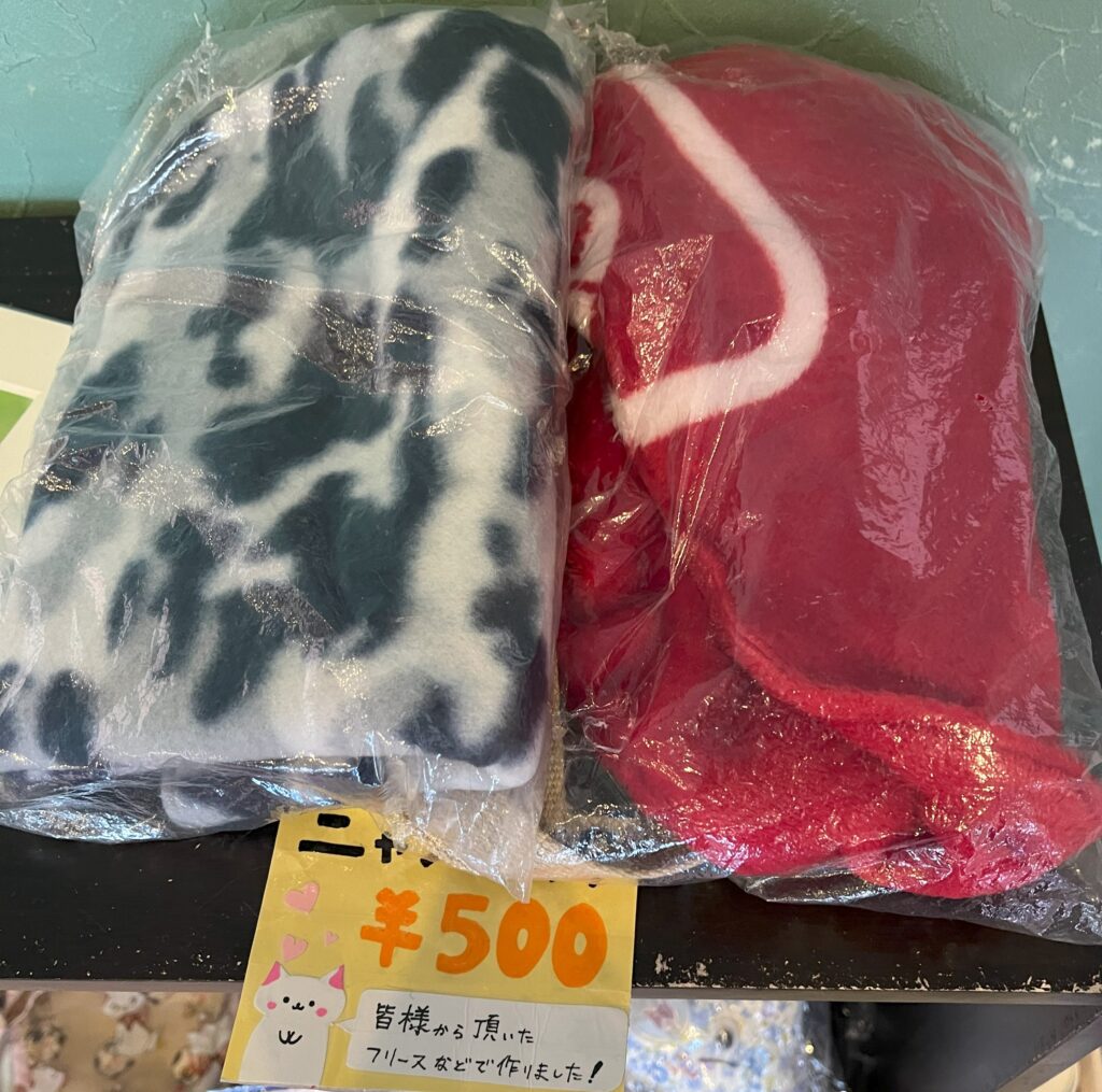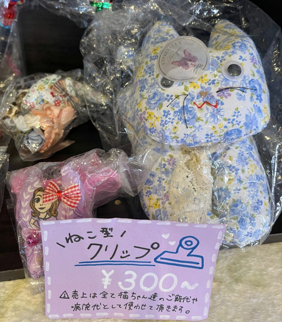 店内販売グッズの紹介第3弾。今回は、里親さんやご支援をしてくださっている方々の手作り商品をご紹介します。猫型のクリップやマスク、着物の生地で作られたチャームなど全て手作りです。売り上げはすーにゃんへご寄付頂いています。ありがとうございます🙇‍♀️