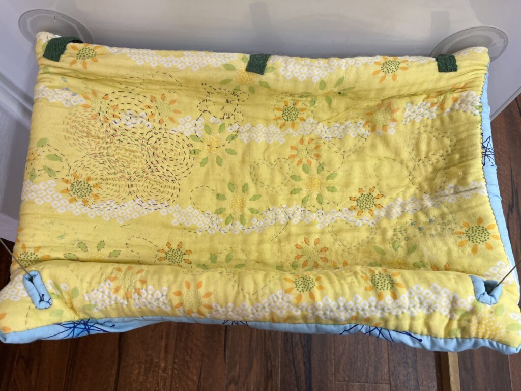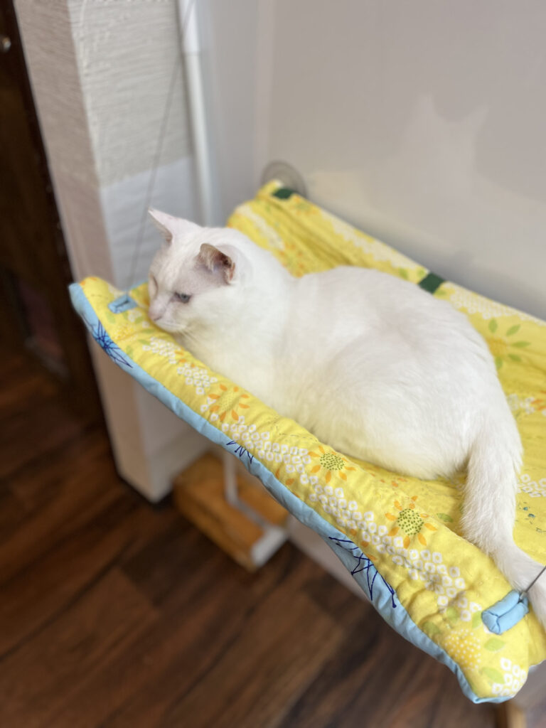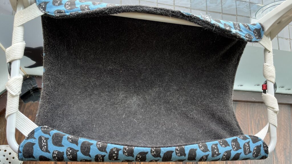 ビゴライブのリスナーさんやお客様からご寄付を頂いた窓用の猫ベッド。ぽかぽかの出窓でお外を眺めるには絶好の商品なのですが、元からしていたベッド部分の布はすぐに破れてしまい骨組みだけが残ってしまうという状態に・・・😭。そこで、ケージ用のニャンモックを代用して出窓でニャンスタッフ達がくつろげるようにしているのですが、吊り紐の部分を骨組みに巻き付けてカラビナで固定するというちょっと不細工な仕上がり💦そこで、お掃除や段ボールの爪とぎの製作などで業務提携をしている就労支援B型事業所の「オリーブ」さんにご相談したところ、しっかりとした可愛いベッド部分を作って下さいました。ニャンスタッフ達もお気に入り💕